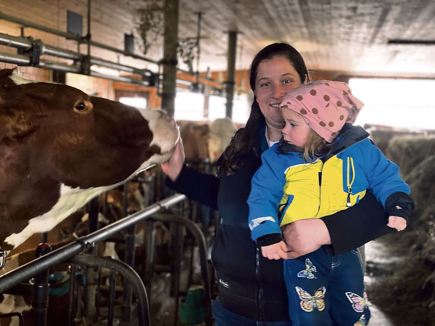 Nun knackt und rauscht es im Empfänger des Babyphones, dann folgt fröhliches Plappern. Das ist Tochter Kerstin, vor kurzem zwei geworden. Der Mittagsschlaf ist vorbei. Nach ihren Eltern hat nun auch die Kleine das Glück, auf einem Bauernhof aufzuwachsen. Begeistert steuert sie auf dem Vorplatz den Hofhund an. Mädchen und Hund sind grosse Fans voneinander. «Ich bin gerne draussen, gerade mit der Kleinen», so Doris Friedli.
