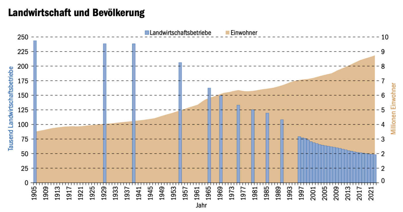 Die Mechanisierung und Chemisierung der Landwirtschaft liess nicht nur das Tätigkeitsgebiet der Bäuerin schrumpfen, sondern auch die Zahl der Betriebe. Einerseits machten es Maschinen und der effiziente Einsatz von Chemikalien dem neu entstandenen «Einmannbetrieb» möglich, grössere Flächen zu bewirtschaften. Andererseits mussten die hohen Investitionskosten aufgebracht und amortisiert werden – auch dies förderte den Konzentrationsprozess hin zu weniger, dafür grösseren Betrieben. Seither geht die Zahl der Landwirtschaftsbetriebe in der Schweiz stetig zurück – allein in den letzten zwanzig Jahren um rund einen Drittel . Dabei zählt der durchschnittliche Schweizer Betrieb im internationalen Vergleich nach wie vor zu den kleinen Fischen.