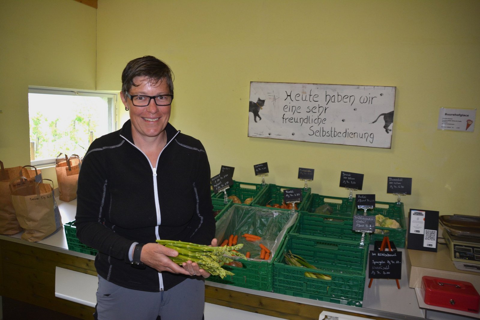 In Sonja Boogs Garten und Treibhaus wächst ganz viel Gemüse, das sie im Hofladen und am Buuremärt in Willisau vermarktet. Von Kartoffeln über Kefen und Tomaten, Melonen bis zu Gurken und Spargeln wächst ein vielseitiges Sortiment an Gemüse auf ihrem Betrieb. «Die Spargeln laufen im Moment sehr gut, die kommen frisch aus dem Garten», erklärt Sonja Boog. Auch selbst gemachte Eierteigwaren, Pesto, Sirup und viele andere Produkte sind in ihrem Laden zu finden. Dieses Jahr sei sie zwar etwas im Verzug mit Gemüse, das heisst, es wurde später reif.