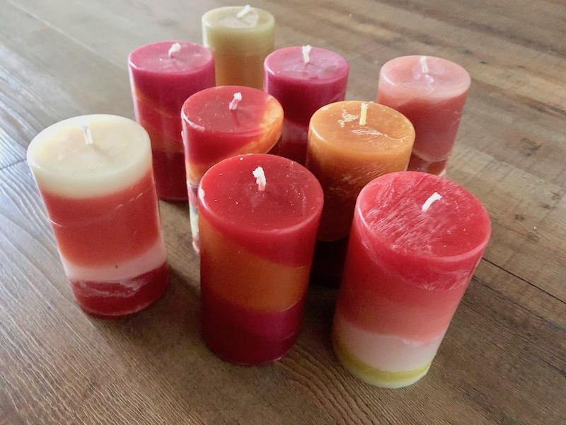 6. Für bunte Kerzen: etwas Wachs einfüllen, auskühlen lassen, nächste Lage mit Wachs in einer anderen Farbe usw. Spannend sind schräge Farbverlaufe, dazu die Form beim Wachsabkühlen etwas schräg stellen.