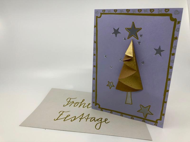Noch schöner und persönlicher wird die Weihnachtspost mit selbst gebastelten Karten. Wie beispielsweise mit dieser Christbaumkarte.