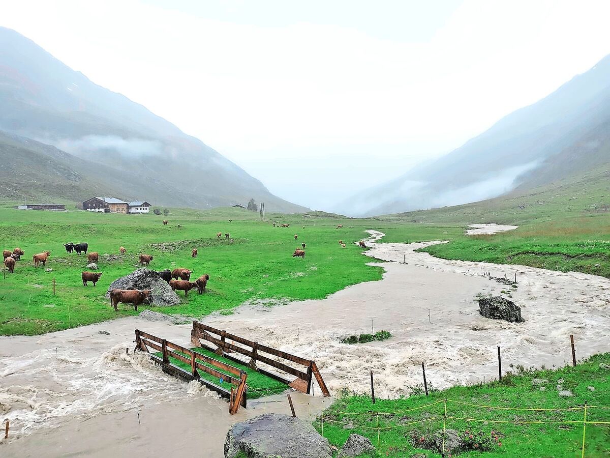Am letzten Wochenende fluteten diese Wassermassen etwa das Dischmatal in Davos. Das von Alpen geprägte Seitental, wo im Normalfall ein Bach fliesst, glich einem Fluss. Vom Fusse des Grialetsch-Gletschers beim Dürrboden bis nach Davos hinterliess das Unwetter überflutete Alpweiden und ausgespülte Strassen.
