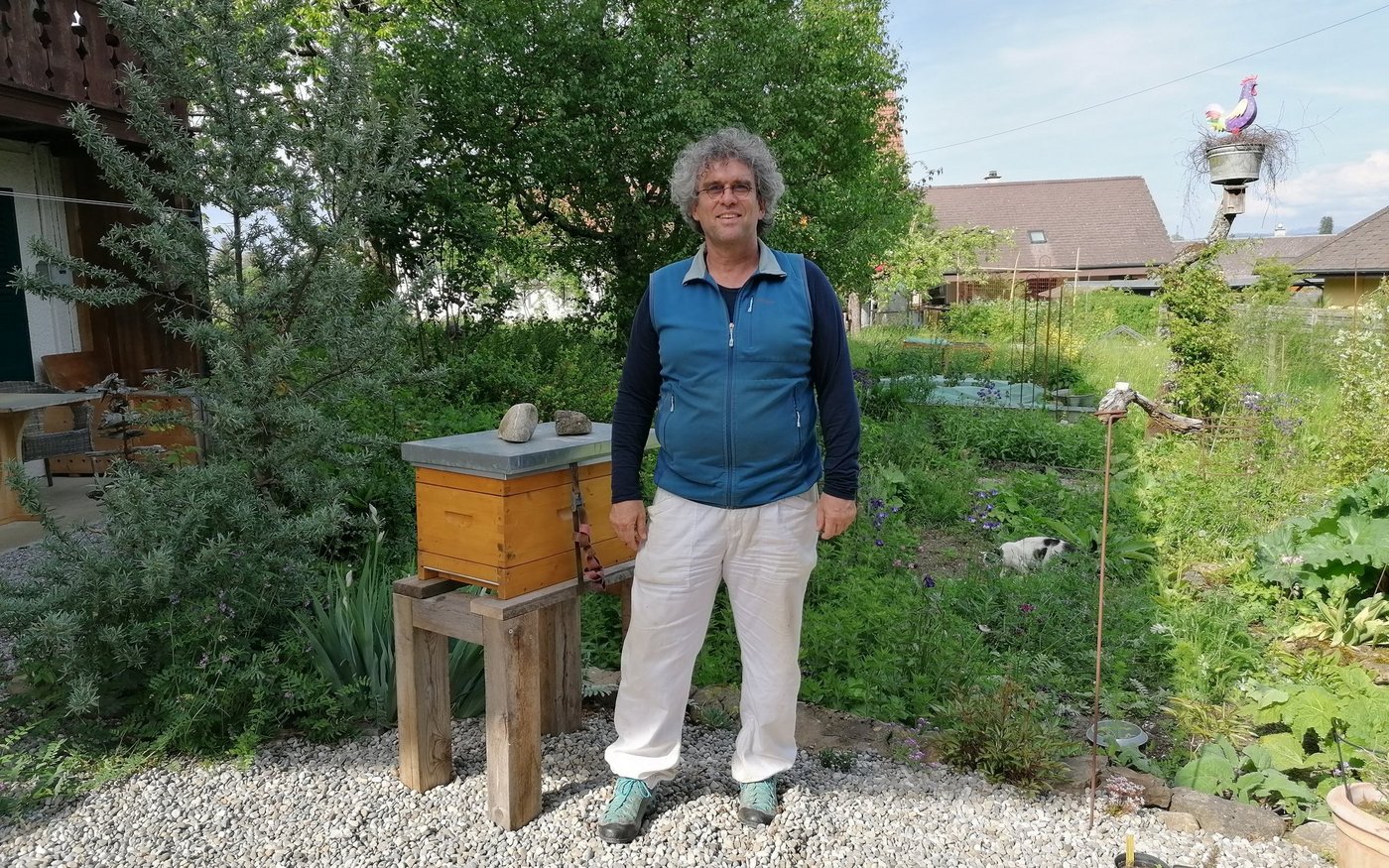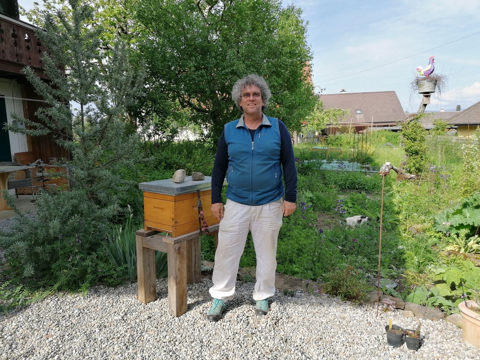 Einige Bienenkästen sind gut sichtbar im Garten verteilt: «Das ist der Kindergarten», sagt er und meint damit die Jungvölker seiner jeweils ungefähr 25 bis 30 Bienenvölker. Der Rest ist an einem anderen Standort weiter weg platziert.