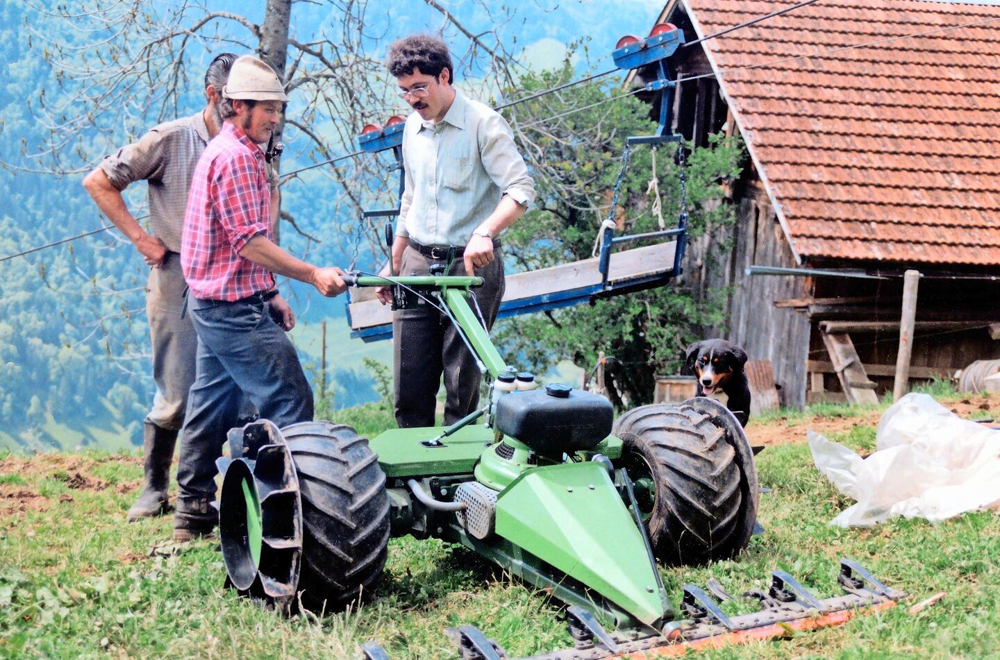 Das wollte Hans Jost ändern. Deshalb versuchte er, für den Betrieb in Bürglen einen Motormäher zu konstruieren, den eine Person ohne grössere Kraftanstrengungen gefahrlos einsetzen konnte. Den ersten Prototypen des in der Folge «Kolibri» genannten Mähers, den Jost ausserhalb seiner beruflichen Tätigkeit entwickelte, hat er 1983 im Emmental und im Berner Oberland getestet. Nach den Anpassungen, die aufgrund der Testeinsätze vorgenommen wurden, erfolgte der Transport des «Kolibri» nach Bürglen auf den Einsatzbetrieb, der nur per Seilbahn erreichbar war.