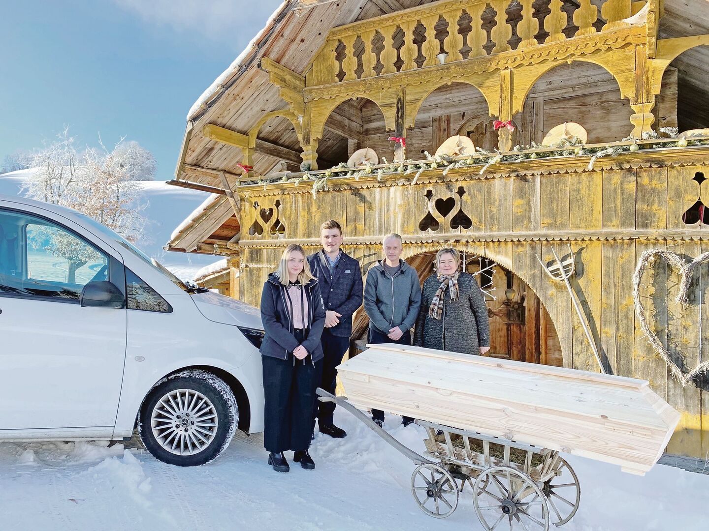 Es rumpelt. Ein junges Paar, elegant angezogen, zieht einen Sarg auf einem Leiterwagen hinter sich her zum Leichenwagen. Das Auto ist diskret weiss wie der Schnee. «Es ist ein ungewohntes Bild, so ein Sarg, nicht? Ein starkes Symbol», sagt Diana Wälti.