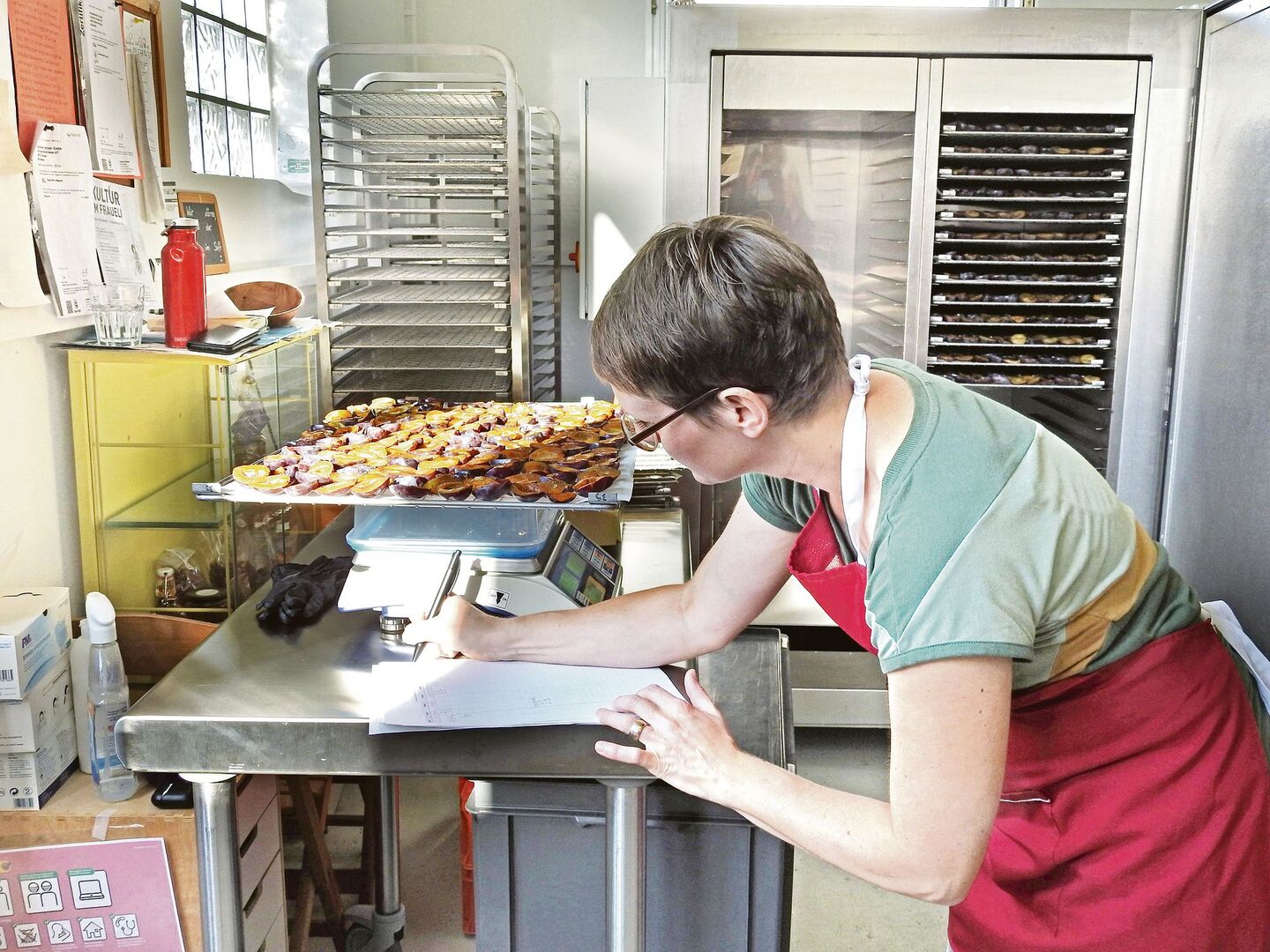 In den Räumlichkeiten im Parterre eines alten Fabrikgebäudes herrscht emsige Geschäftigkeit – und doch ist es still. Unter der kundigen Anleitung von Bettina Aeberli sitzt eine kleine Gruppe von Menschen an einem grossen Tisch und rüstet Zwetschgen. Viele von ihnen sind Seniorinnen aus der Region, aber auch junge Menschen sind dabei, darunter auch zwei Kriegsflüchtlinge aus der Ukraine. In regelmässigen Abständen überreichen sie der Arbeitgeberin ein grosses Blech mit frisch gerüsteten Zwetschgen. Sie wägt es und schiebt es in den Ofen. «Es ist auch schon gesungen worden am Tisch», sagt sie. «Oder es kamen interessante Gespräche in Gang». Oft bleibe es aber so ruhig. «Die Leute schätzen das Meditative und auch das Gesellige an dieser Arbeit», meint sie.