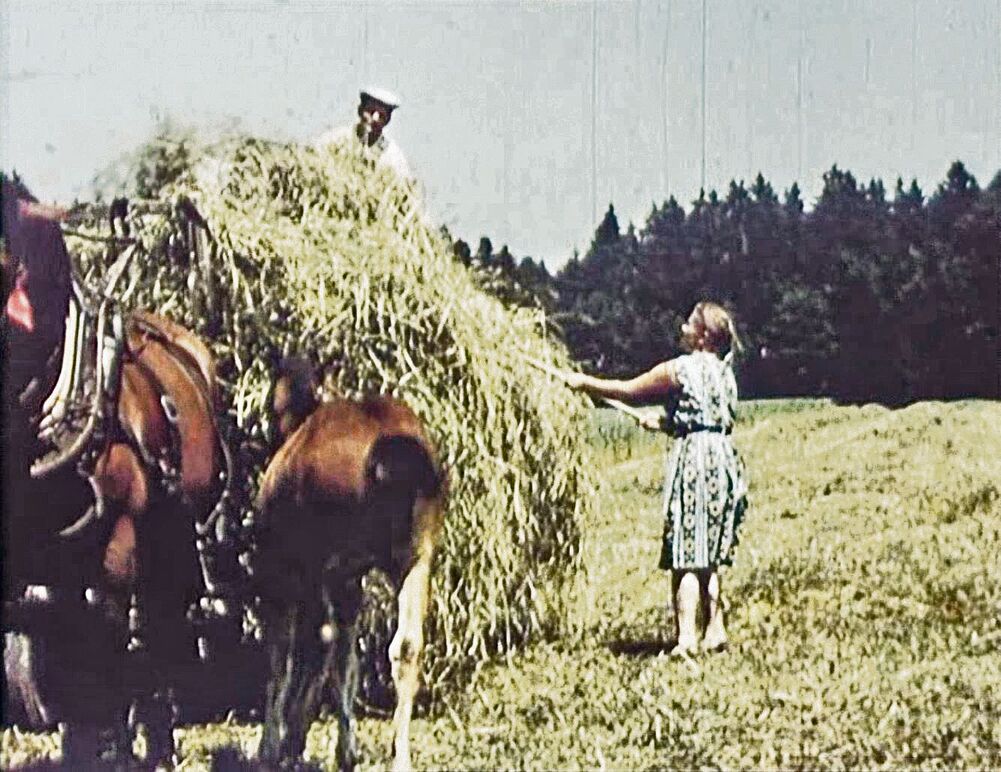 Der Film beginnt mit einer Szene, in der eine Bäuerin und ein Bauer einen Wagen mit Heu beladen. Gezogen wird das Fuder von einer Stute, deren Fohlen frei mitläuft (und dabei seine zukünftige Aufgabe als Zugtier kennenlernt). Das war schon 1966 eine eher selten anzutreffende Szene. Aber sie ruft uns in Erinnerung, dass landwirtschaftliche Arbeiten bis in die 1960er-Jahre anstrengend und oft auch mühsam waren und dass Menschen und Tiere auf den Höfen fast immer gemeinsam in enger Kooperation arbeiteten. Mit anderen Worten: Tiere waren unentbehrliche Arbeitskameraden, und Bäuerinnen spielten auf den Betrieben eine zentrale Rolle.