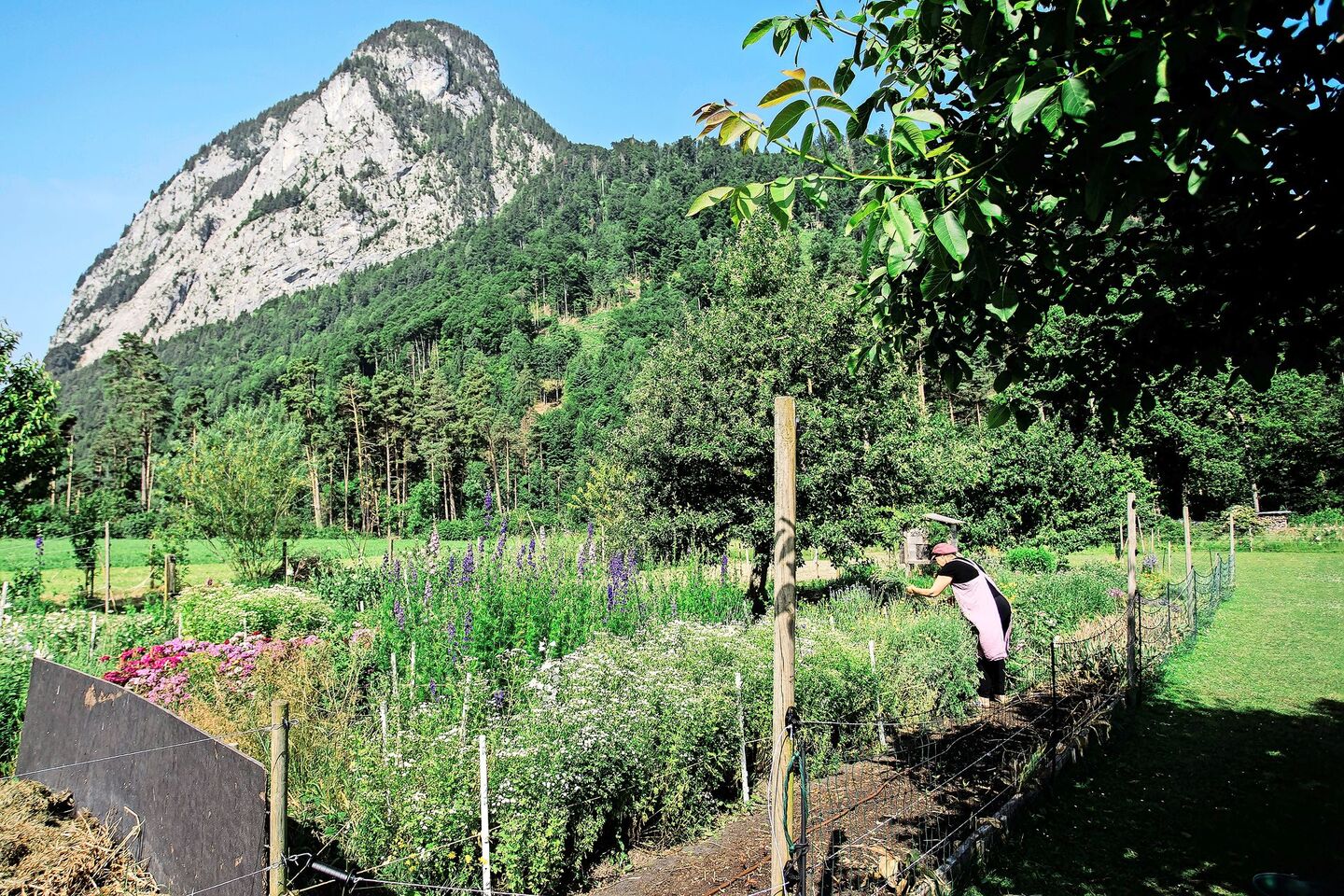 In eine bestehende Wiese setzten Carmen von Ballmoos und ihr Mann Hochstammbäume. Dazwischen legte sie ihre ersten drei Blumenbeete an, ohne Umgraben. Vielmehr legte sie den Boden mit Karton aus und bedeckte die Fläche mit rund zehn Zentimetern Komposterde. «Bald kamen ein viertes und ein fünftes Beet dazu», erinnert sie sich schmunzelnd. Sie fing an, mit dem Ansäen von Wildblumen zu pröbeln, etwa mit Färberweid, Margeriten oder auch Rainfarn. Später kamen auch klassische Beetblumen und Stauden dazu, wie Dahlien oder Pfingstrosen.
