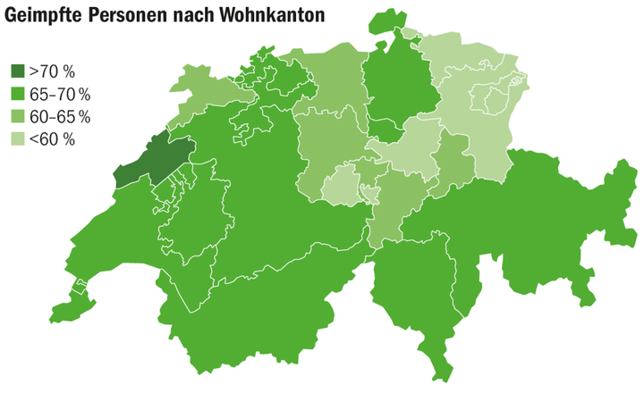 Aktuell sind 63,8 % der Gesamtbevölkerung vollständig geimpft. Weitere 2,2 % haben den ersten Piks hinter sich. Im Kanton Neuenburg sind 70,41 % der Gesamtbevölkerung gegen Corona geimpft. Das ist Schweizer Höchstwert. Gefolgt vom Kanton Basel-Stadt (69,53 %) und dem Kanton Tessin mit 69,08 %.