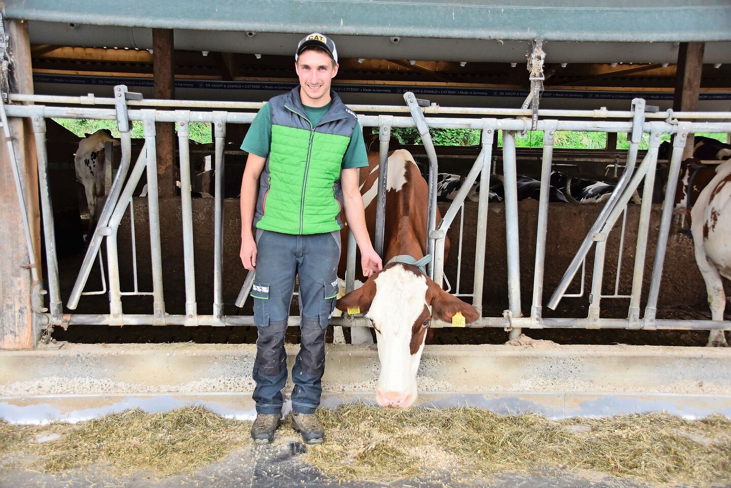 «Komm, ich zeige dir jetzt mal meinen Lehrbetrieb», sagt Dario Rattaggi und zeigt sogleich mit seiner Hand zu den Kälbern. Diese hier würden noch Milch bekommen, die Grösseren seien dort auf der Weide. «Der Betrieb umfasst insgesamt 50 Hektaren mit 65 Kühen. Angebaut werden zwölf Hektaren Mais und etwas Getreide», beschreibt der Junglandwirt seinen Lehrbetrieb.