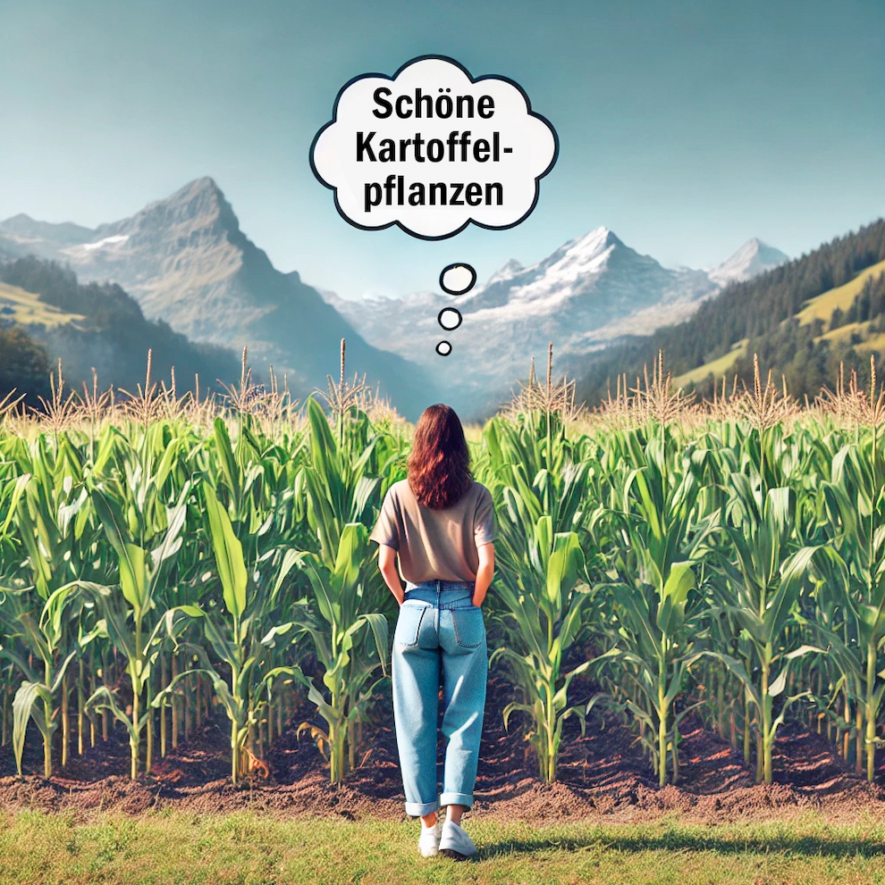 Bäuerin S. erzählt: «Einige Leute kamen zur verabredeten Kartoffelernte aufs Feld. Bei der Begrüssung stand eine Frau staunend vor den Maisstauden der Nachbarparzelle und sagte: ‹Aha, so sehen Kartoffelpflanzen aus!›»