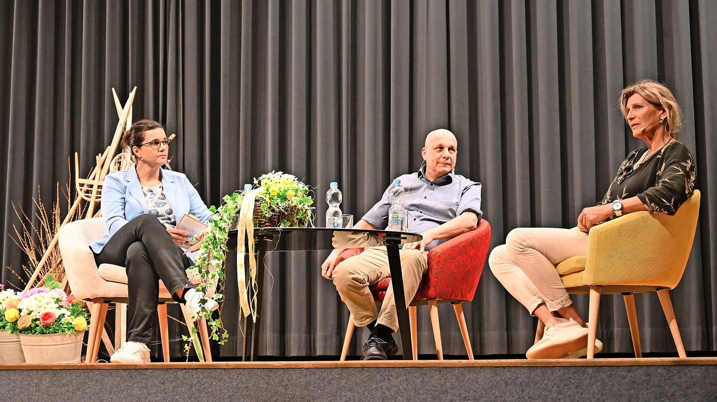 Die Szenerie auf der Bühne mit farbigen, gemütlichen Sesseln und frühlingshaft-fröhlicher Dekoration vermittelt Wohnzimmeratmosphäre. Nicole Reusser, Bäuerin und Lehrerin Hauswirtschaft am Inforama, moderiert das Gespräch auf erfrischende Art und Weise, aber immer sehr einfühlsam. Auch wenn viel gelacht wird, sind einige Erlebnisse der Gesprächspartner nicht immer leichte Kost. Das wird besonders deutlich, als die Moderatorin aus den jeweiligen Büchern, die Binsack und Neugebauer geschrieben haben, Passagen vorliest. Sowohl die Bergsteigerin als auch der Manager zeigen sich dabei tief bewegt.