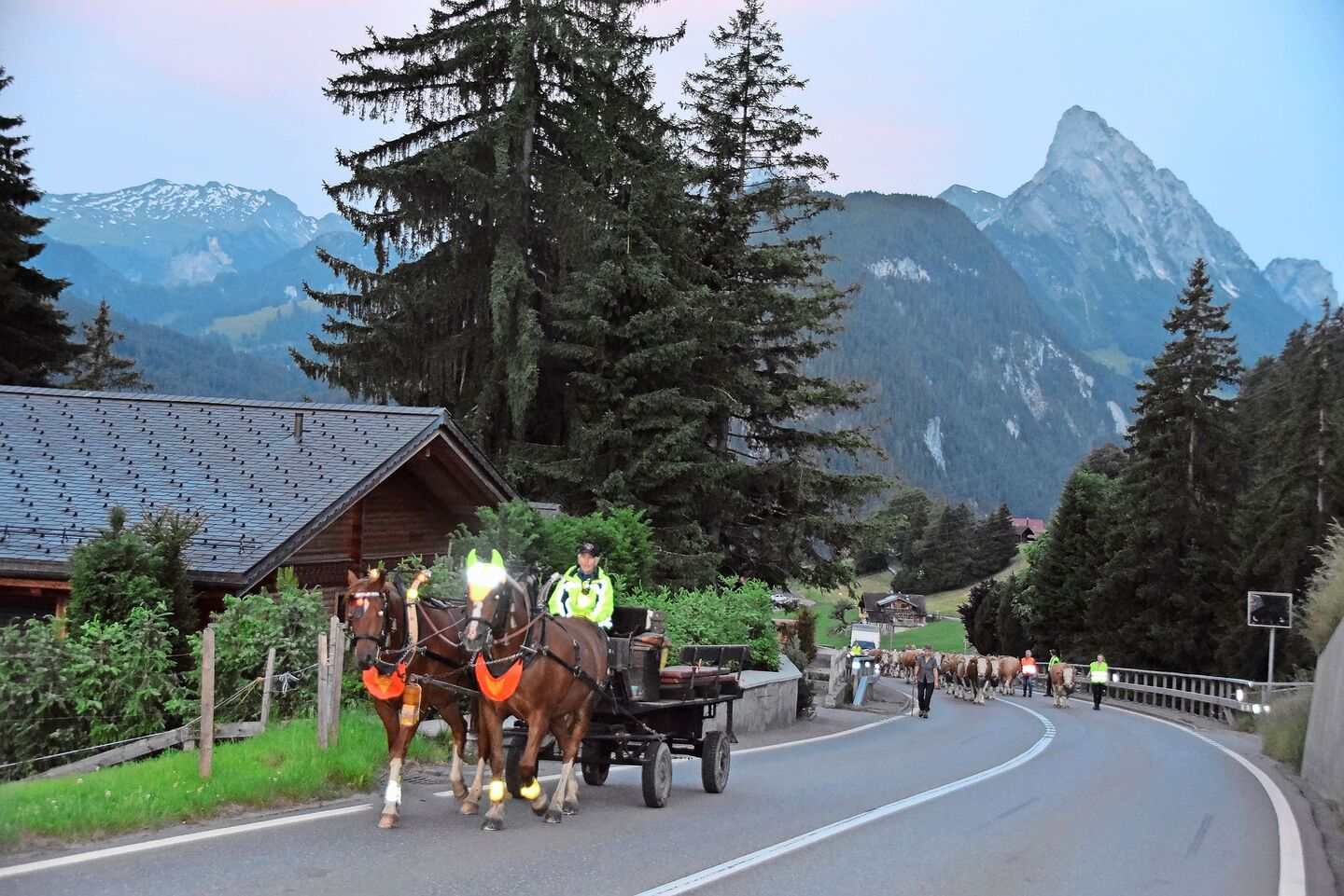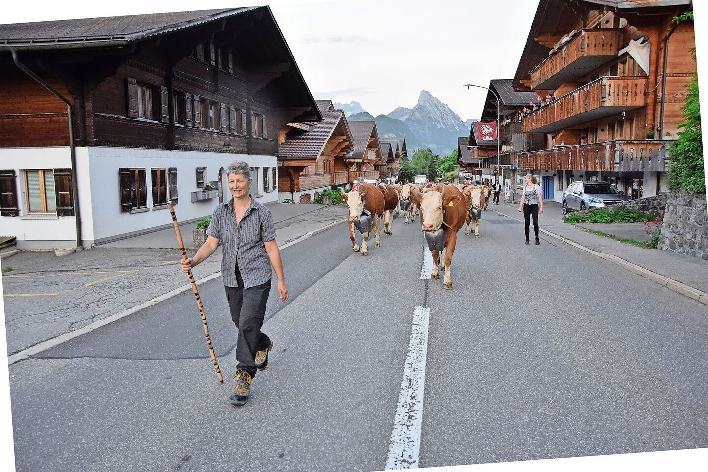 Das Treichelgeläut ist parat, jede Kuh hat eine um den Hals. Kurz nach vier Uhr setzt sich der Zügeltross in Bewegung, die Treichelkühe vorneweg, später kommen die Rinder noch dazu. Noch ist es dunkel, doch die Kühe kennen den Weg. Die Leitkuh gibt das Tempo vor – das Treichelgeläut geht unter die Haut. Jetzt biegt der Zügeltross in die Hauptstrasse ein. Mit zügigen Schritten geht es Richtung Schönried. Die ersten Einheimischen und Touristen öffnen ihre Fenster, stehen im Nachthemd auf dem Balkon: Hier wird ein Handy gezückt, dort ein Fotoapparat hervorgeholt. Viele Bilder werden gemacht, Bilder, die ausserhalb der Schweiz für viel Furore und für viel Werbung sorgen werden.