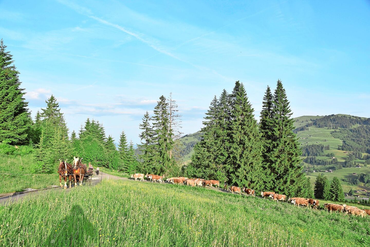 Nun sind die Kühe und Helfer in Saanenmöser angekommen. In der Zwischenzeit ist es hell geworden. Mitten im Dorf biegt die Herde ab, jetzt geht es weiter über den Bahnübergang, dann geht es steil bergauf Richtung Hornberg zu. Die Kühe legen das Tempo vor, von einer Pause keine Spur. Zügig schreiten sie voran, über eine Stunde dauert es, bis man oben auf der Passhöhe beim Berghotel Hornberg angekommen ist. Die Leitkuh Keila mit ihren neun Jahren kennt den Weg, viele Male ist sie im Frühling schon mitgelaufen, schwungvoll schwingt sie ihre Treichel, stolz streitet sie voran. «Scho iri Muetter isch gäng zvorderscht glofe, Leitkuh si ligt halt ir Familie», meint der Reinzüchter lachend. Jetzt wird der Weg eben, es geht der Bergflanke entlang. Das letzte Stück ist für Tier und Mensch ein Genuss. «Chum, chum, chum», ruft die Sennerin. Die Alphütte kann man jetzt schon sehen, es ist nicht mehr weit. Die Uhr zeigt schon gegen neun Uhr, es ist bald geschafft. «Wenn äs z Bärg geit si mi Frau Anita u i mit Härzbluet derbi, äs isch ifach s Schönschte, was äs git», meint der Landwirt. Es sei fast das Schönste vom ganzen Jahr, wenn nicht vom ganzen Leben, wenn man auf die Alp gehen kann und im Herbst blumengeschmückt wieder talwärts zieht.