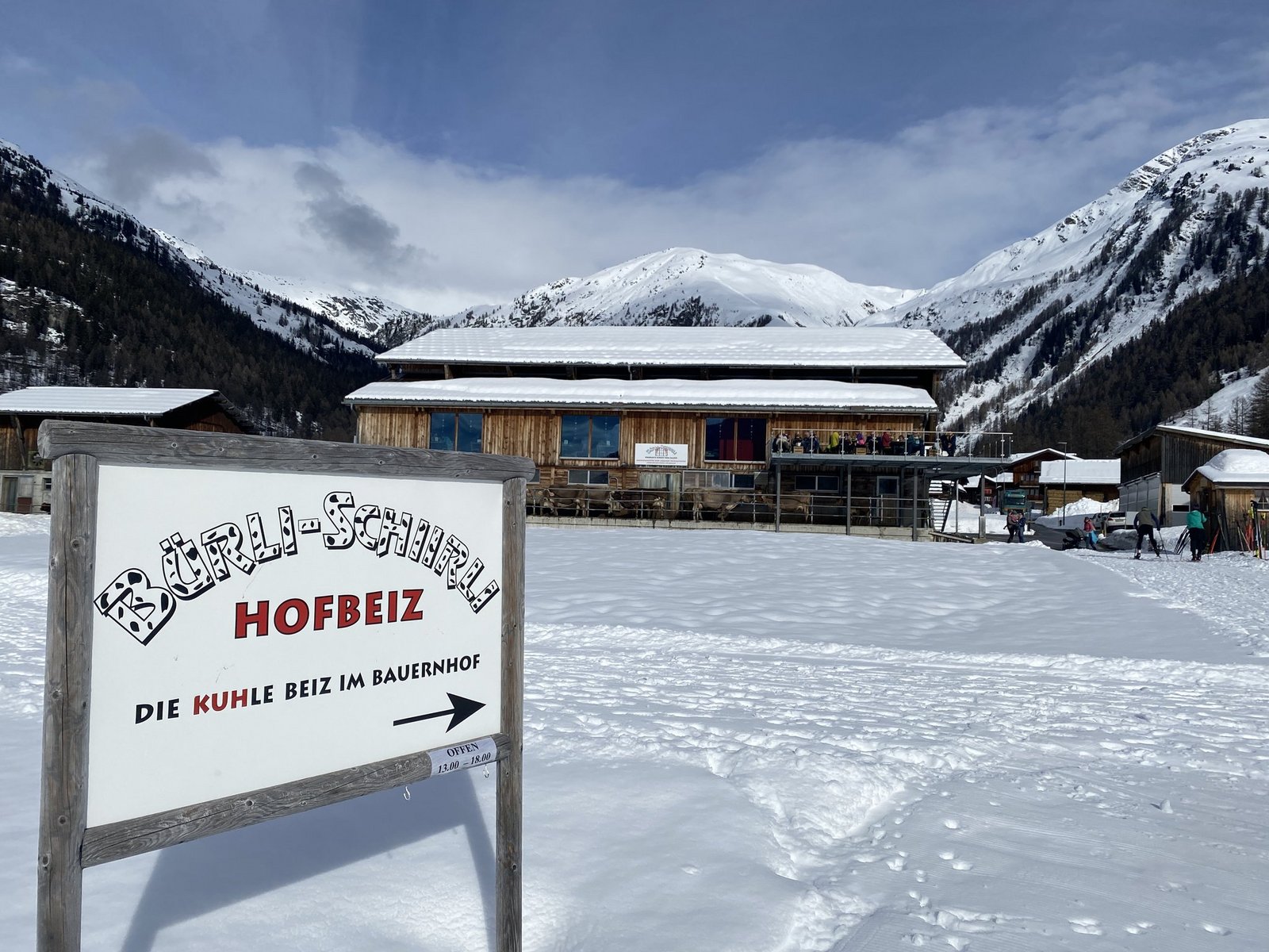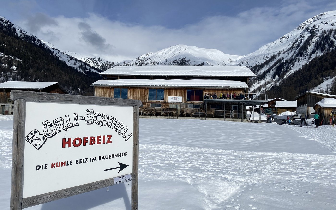 Ebenerdig lassen sich die Kühe im Laufhof die Wintersonne aufs Fell scheinen. Darüber sitzen Feriengäste auf einer Terrasse mit Blick auf eine der vielen Loipen im Goms. Der Hof von Carmen und Egon Hischier sowie Mitinhaberin Anina Ambauen in Oberwald VS verbindet Landwirtschaft mit Erlebnisgastronomie und einem Dorfladen.
