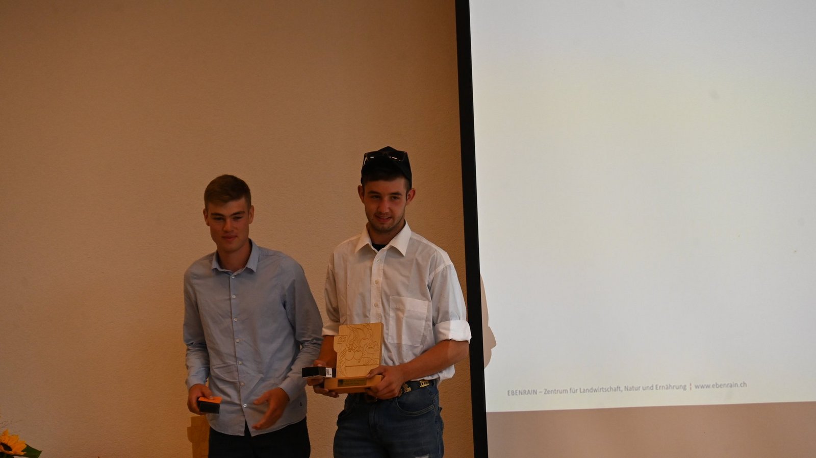 Meist laufen die Abschlussfeiern an den Berufsbildungsstätten jedes Jahr nach dem bewährten Muster ab. Heuer hingegen gibt es am Ebenrain eine Neuheit. Die Ehemaligen Ebenrain verleihen zum ersten Mal zwei Wanderpreise. Michael Sutter, Präsident Verein Ehemalige Ebenrain vergibt die eine goldene Kirsche für den besten Fachvortrag. Diese holt sich Matthias Zwygart aus Tenniken. Die zweite goldene Kirsche geht an den besten Vortrag im Bereich allgemeinbildender Unterricht (ABU). Diesen Preis holen sich Timon Ballmer, Oberdorf, und Roman Mundwiler, Zunzgen, für ihre Teamarbeit. [IMG 5]