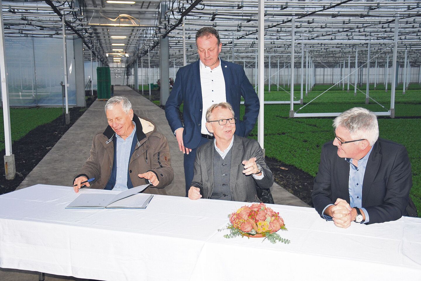 Mit ihrer Unterschrift haben (v. l. n. r.) Pascal Krayenbühl, Didier Castella, Fritz Burkhalter und BLW-Direktor Christian Hofer im November den Startschuss für das PRE-Projekt Bio Gemüse Seeland gegeben. Durch das Projekt sollen der Gemüsebau im freiburgischen Seeland sowie der Tourismus gefördert werden.