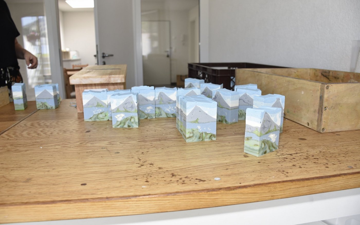 Die Firma «Seifenstück.ch» hat sich auf handgemachte Seifen aus natürlichen Zutaten spezialisiert. Erst gestern wurde eine Charge fertiggestellt. Der üppige Duft komme wohl vom Melissenöl, einem der Inhaltsstoffe, meint Heidi Ryter und deute auf eine mit Backpapier ausgeschlagene Holzkiste auf einem Tisch. Am Boden daneben stapeln sich in braunen Gitterkisten weitere Seifen.