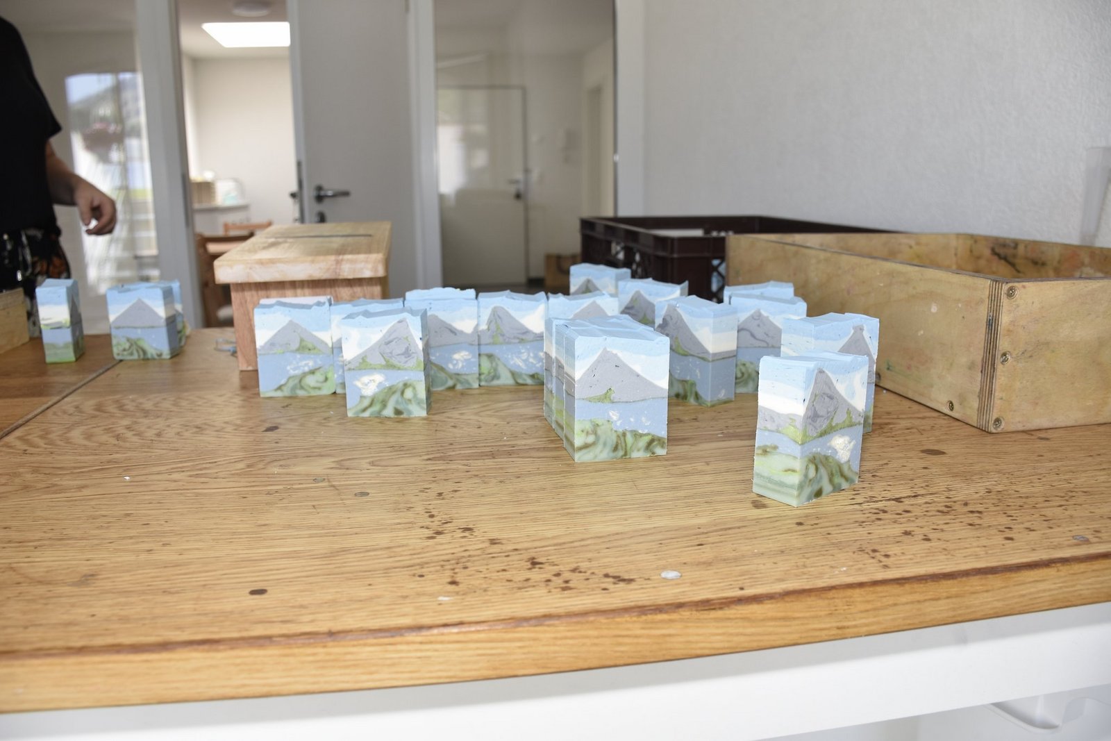 Heidi Ryter kippt einen Seifenblock aus einer Kiste. Hat alles geklappt, sollte auf jedem Seifestück eine Landschaft mit Berg und See zu sehen sein. Mit dem Käseschneider-ähnlichen Gerät teilt sie einen Streifen vom Block ab, betrachtet ihn kritisch und nickt zufrieden. «Das ist mein liebster Arbeitsschritt. Schauen, ob alles so geworden ist, wie ich es mir vorgestellt habe.»