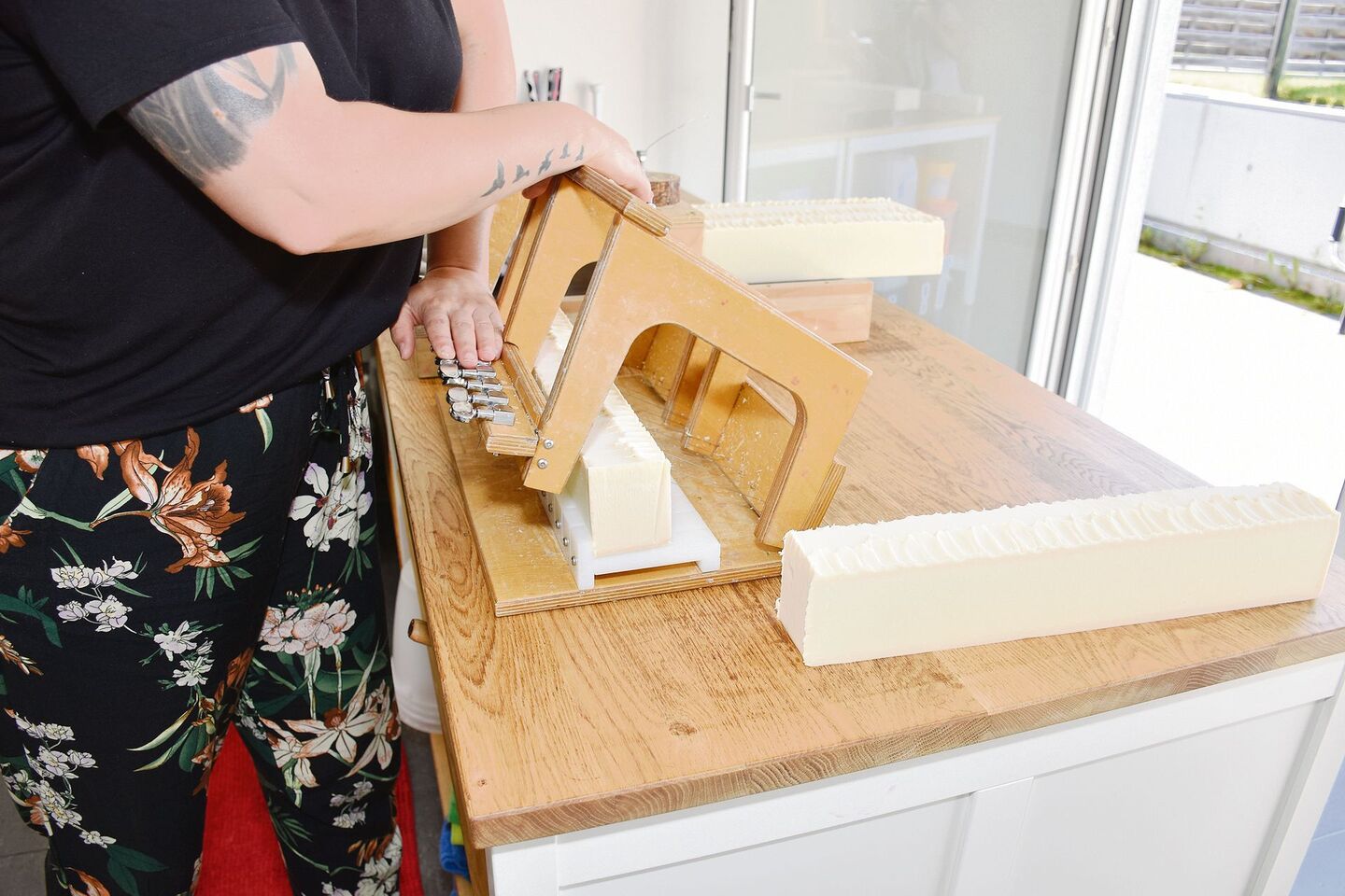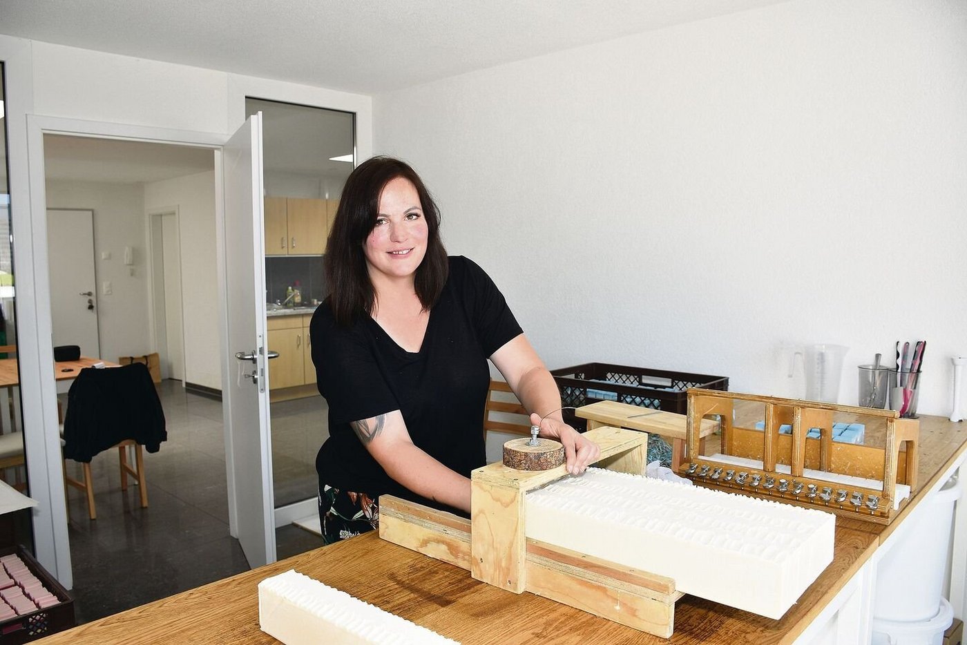 Im angrenzenden Arbeitsraum stehen zwei selbst gefertigte Seifenschneider. Der eine erinnert mit seinen metallenen Hebeln zum Spannen der Drähte auf den ersten Blick an ein Instrument. Der andere hat Ähnlichkeit mit einem Käseschneider.