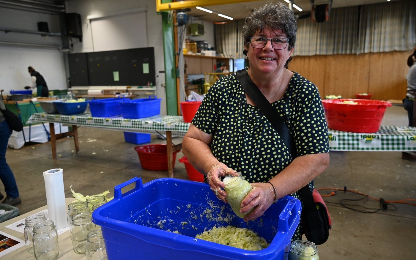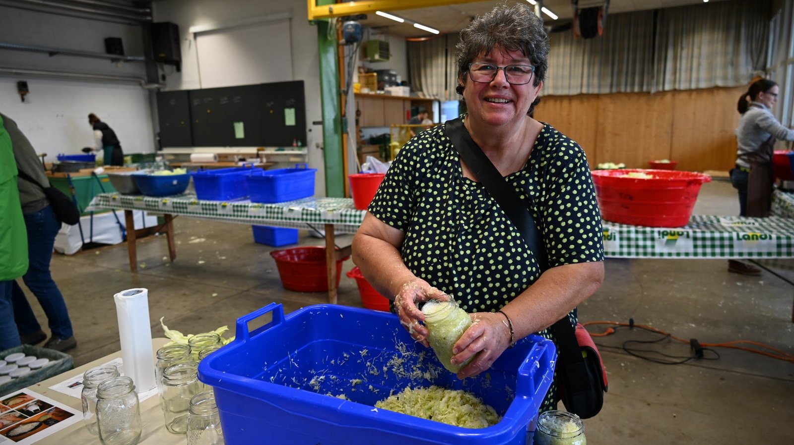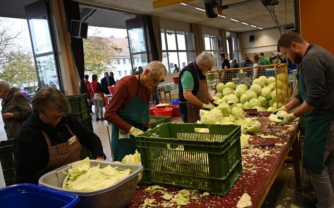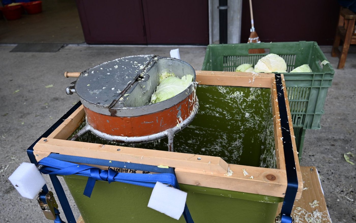 Danach geht es zu den Abfülltischen. Da müssen die Besucherinnen den Chabis gut kneten und drücken bis Saft austritt. Dies kann von Hand geschehen oder mit einem Stössel. Ist der Chabis fertig vorbereitet, wird er satt in die Gläser abgefüllt. [IMG 7]. Diese müssen sauber und steril sein. Und dann braucht es etwas Geduld. Die ersten sieben Tage müssen die Gläser dunkel bei Raumtemperatur in einem Becken stehend ruhen. Das Becken dient dazu, allfälligen austretenden Saft aufzufangen. Nach dieser Gärphase werden die Gläser sechs bis acht Wochen kühl gestellt, etwa im Keller.