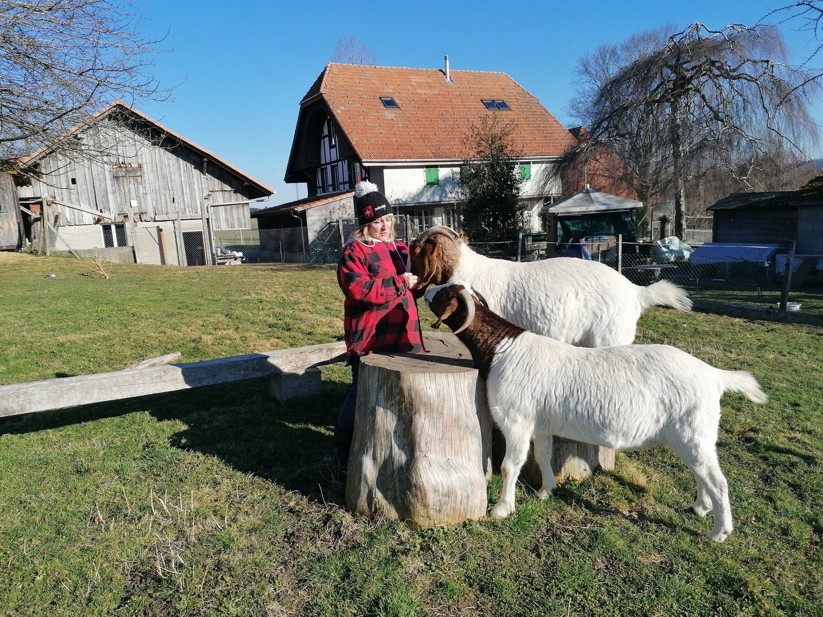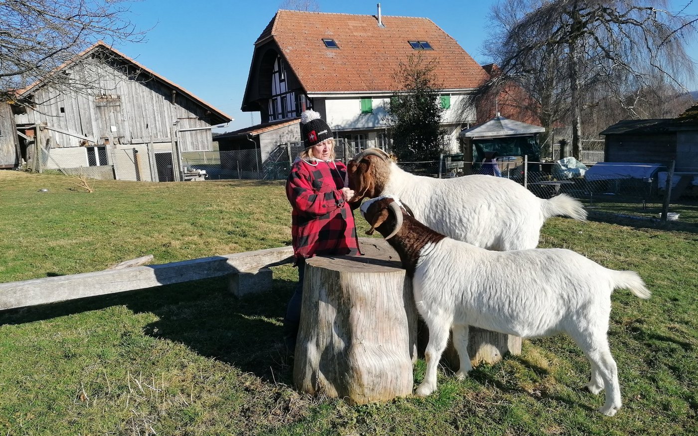 Dann sind da noch die zwei zutraulichen Hühner Bernadette und Trudi, die einen Fuchsangriff überlebt haben und aufgepäppelt wurden. «Die stehlen auch schon mal unsere Salzstängeli beim Apéro oder hüpfen uns auf den Schoss», sagt Judith Schwarzenbach, die sich sichtlich über den Schabernack, den ihre Tiere im Kopf haben, amüsiert. Sie tollt auch mal gerne mit ihren Burenziegen auf der Weide umher.