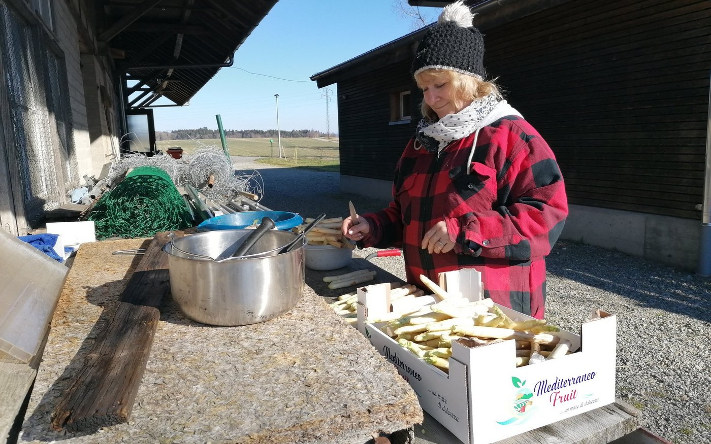 Im Dorfladen kann sie regelmässig Frischware abholen, die nicht verkauft wurde. So ist Judith Schwarzenbach heute gerade daran, die weissen Spargeln für die Schweinchen zu rüsten. Auch altes Brot bekommt sie teils von Dorfbewohnern, der Bäckerei, oder sie geht bei einem Detailhänder Brot vom Vortag für einen billigen Preis kaufen. Heu und Stroh werden ihr gespendet.