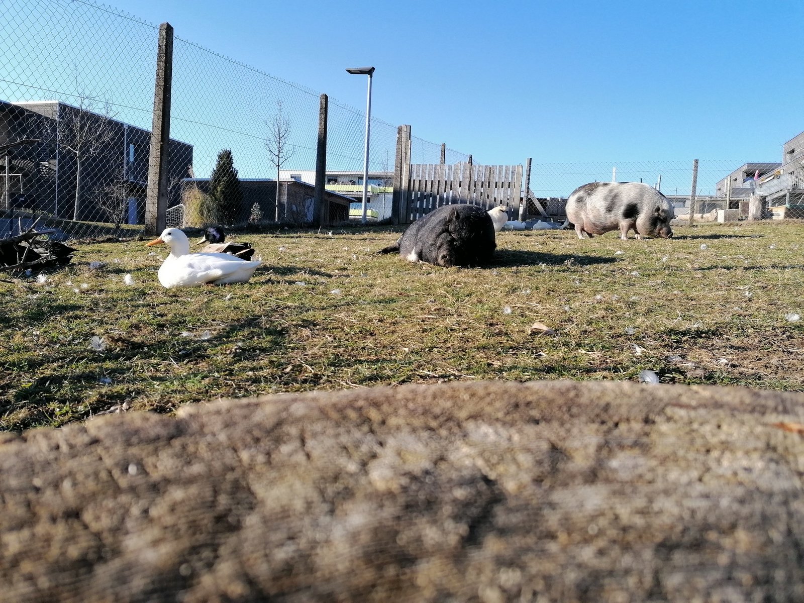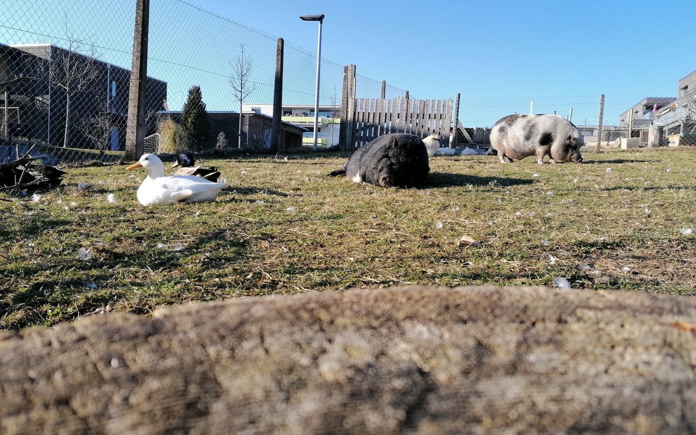 Greti und Hardy sonnen sich genüsslich auf der Wiese und grunzen vor sich her. Auch die Laufenten, wie weisse Schneetupfer auf dem Gras, haben sich rundherum verteilt, um Sonne zu tanken. Hier, im Hobby-Zoo von Judith Schwarzenbach in Grossaffoltern BE, fühlen sich die zwei Minipigs offenbar ziemlich wohl.