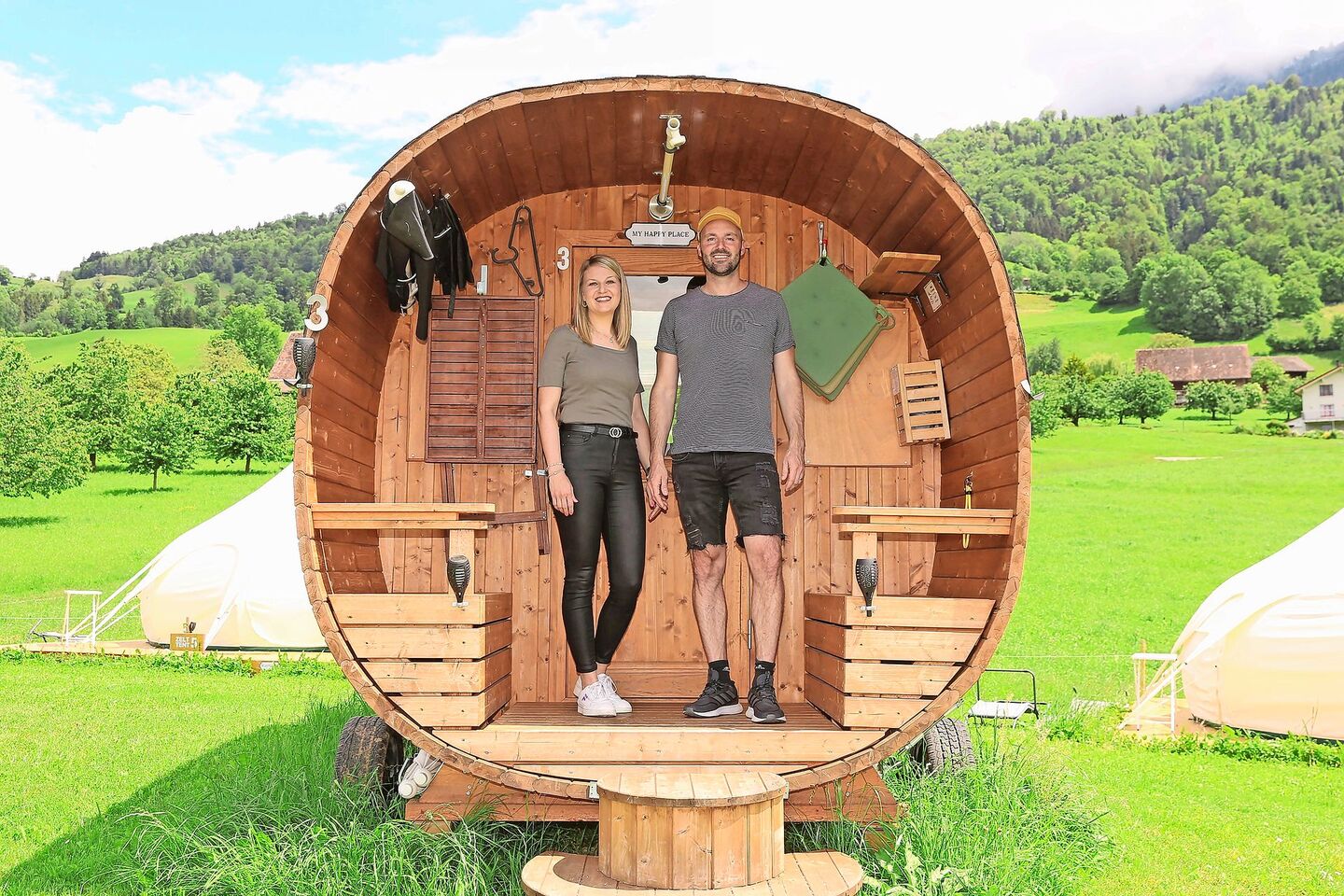 Vor drei Jahren beschlossen Carmen und Pirmin Gisler, gemeinsam den Hof weiterzuführen. Auf dem sechs Hektaren grossen Betrieb kann man heute Alpakas, Zwergziegen, Hühner und Bienen beobachten. Ebenfalls stehen mehrere Hochstammbäume auf dem Hof. Die Bewirtschaftung mit den Mutterkühen wurde Ende Oktober 2023 aufgegeben. Das junge Paar erkannte das grosse Potenzial ihres Betriebes im Bereich Agrotourismus und startete im Frühling 2023 mit einem exklusiven «Lotus Belle»-Zelt und einladenden Campingfässern. «Wir rechneten beim Start mit einer Auslastung von 30 Prozent. Dass unser Angebot so stark nachgefragt wird und wir fast immer ausgebucht sind, überraschte uns schon sehr», blickt Pirmin Gisler zurück. Auf das Jahr 2024 wurde das Angebot leicht erweitert, sodass heute pro Nacht rund 20 Personen auf dem Hof übernachten können. Das Angebot sei auf die Monate April bis Oktober beschränkt, alle Objekte würden über die Wintermonate wieder eingelagert, erklärt Gisler: «Die Zelte werden abgebaut und die mit Rädern ausgestatteten Campingfässer unter Dach gestellt.»