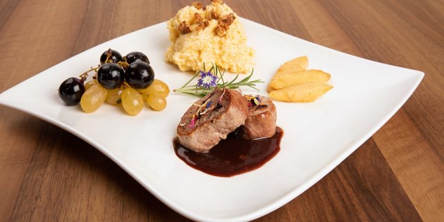 Sonja Vogt-Meyer hat als Hauptspeise die Landfrauen mit Schweinsfiletmedaillons vom Nachbarhof an Rotweinsauce, geschmorten Trauben, Polenta mit Baumnussgarnitur und karamellisierten Quittenschnitzen verwöhnt. Als in der Sendung Sonjas Woche gezeigt wurde, war auch die Ernte von Spinat zu sehen, welcher auf dem Hof angebaut wird. Ich hätte darauf gewettet, dass sie daher Spinat in ihr Menü einbaut, was leider nicht der Fall war. Tja, schade. Diese Wette habe ich leider verloren. Die Schweinefiletmedaillons wurden im Niedergar-Verfahren zubereitet. Diese Methode eignet sich bestens um Gäste zu bewirten: Das Fleisch verliert praktisch keinen Fleischsaft und wird butterzart. Einziger Nachteil: Niedergegart wird bei tiefen Temperaturen, normalerweise um die 80 Grad Ofentemperatur. Das heisst, dass niedergegartes Fleisch nicht sehr heiss ist und auch auf vorgewärmten Tellern rasch auskühlt. Sonja Vogt-Meyer hat dieses Problem clever gelöst, indem sie das umgekehrte Niedergaren angewandt hat. Normalerweise wird Fleisch vor dem Garen im Ofen zuerst angebraten, egal ob mit tiefer oder hoher Temperatur gebraten wird. Sie jedoch hat das Fleisch ohne vorheriges Anbraten in den Ofen geschoben. Erst kurz vor dem Servieren wurden die Medaillons in einer Pfanne kurz und scharf angebraten und kommen so heisser auf den Teller.