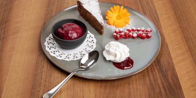 Zum Dessert verwöhnte die Gastgeberin mit einem Trübeli-Trio. Dieses bestand aus einem Schoggikuchen mit weissen Trübeli, Cassisglace sowie Holzofen-Meringue auf rotem Johannisbeerspiegel. Johannisbeeren, oder eben auch Trübeli, Ribiseli oder Meertrübeli genannt, gibt es in drei Farben, welche Sonja Vogt-Meyer alle in ihr Dessert eingebaut hat. Den meisten sind wohl die roten Meertrübeli bekannt. Als Cassis werden die schwarzen Trübeli bezeichnet. Johannisbeeren sind reich an Vitamin C, vor allem die Schwarzen. Ihr Saft hilft dem Körper bei Erkältungen. Aber auch viele Mineral- sowie wichtige Ballaststoffe sind in den kleinen Beeren enthalten. Eigentlich mag ich Johannisbeeren ihrer Säure wegen nicht besonders. Dieses Dessert jedoch hat optisch so appetitlich ausgesehen, dass ich es sehr gerne auch probiert hätte.