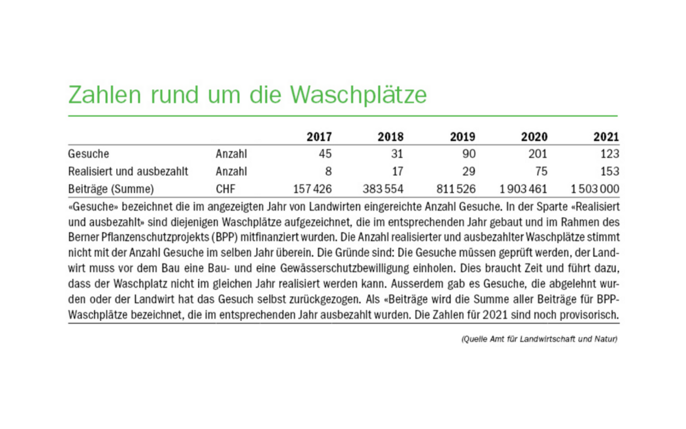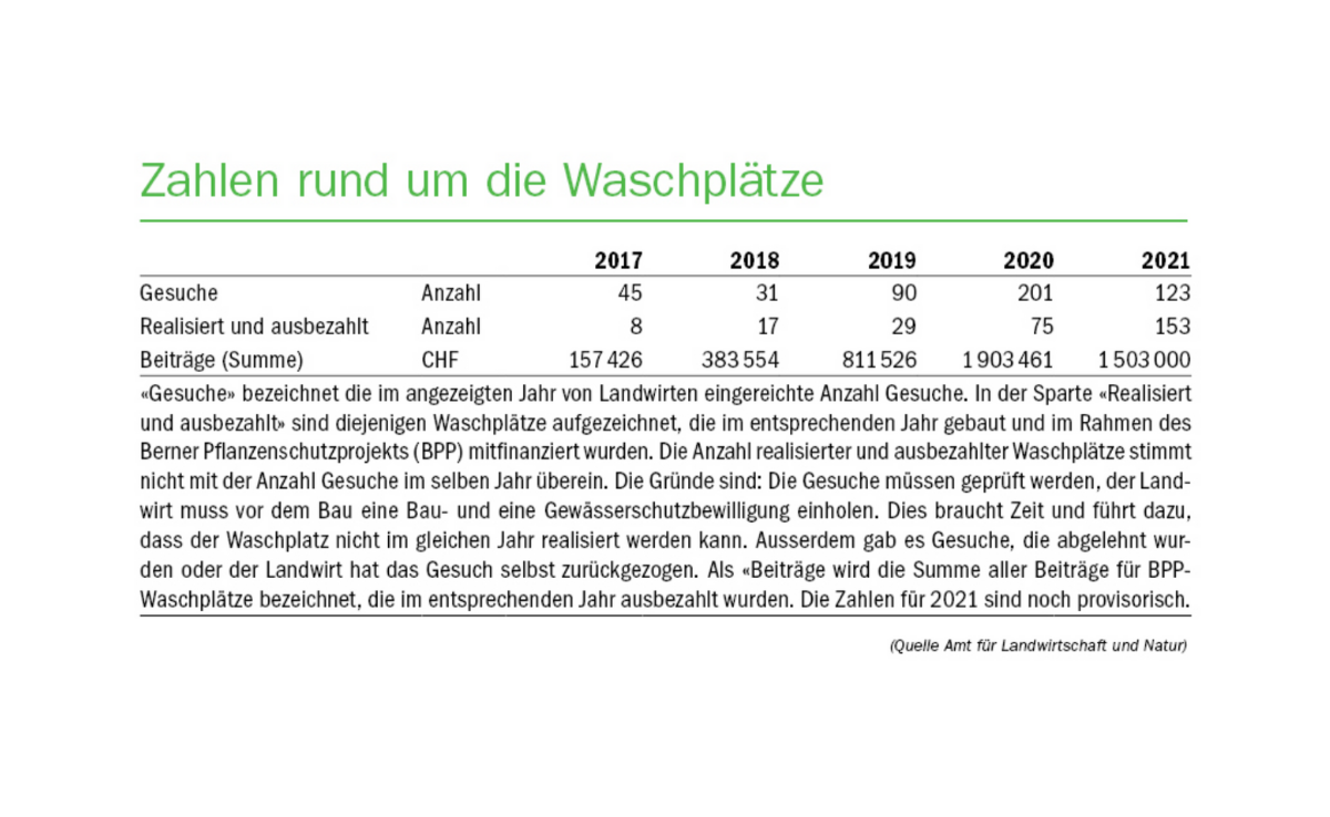 Einer der 13 Kontrollpunkte betrifft die Füll- und Waschplätze für Spritzgeräte. Mangelhafte Situationen wie Risse im Belag oder dass Pflanzenschutzmittel in die Kanalisation gelangen, müssen behoben werden. Im Rahmen des Berner Pflanzenschutzprojekts konnte finanzielle Unterstützung zum Neubau eines konformen Platzes beantragt werden, was auch einige Landwirte in Anspruch genommen haben und nun damit auf der sicheren Seite sind.