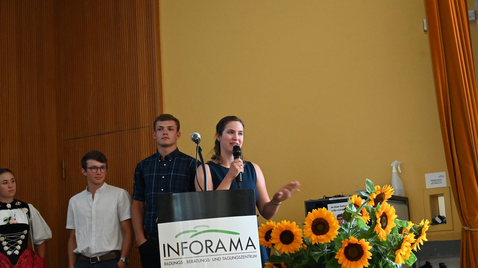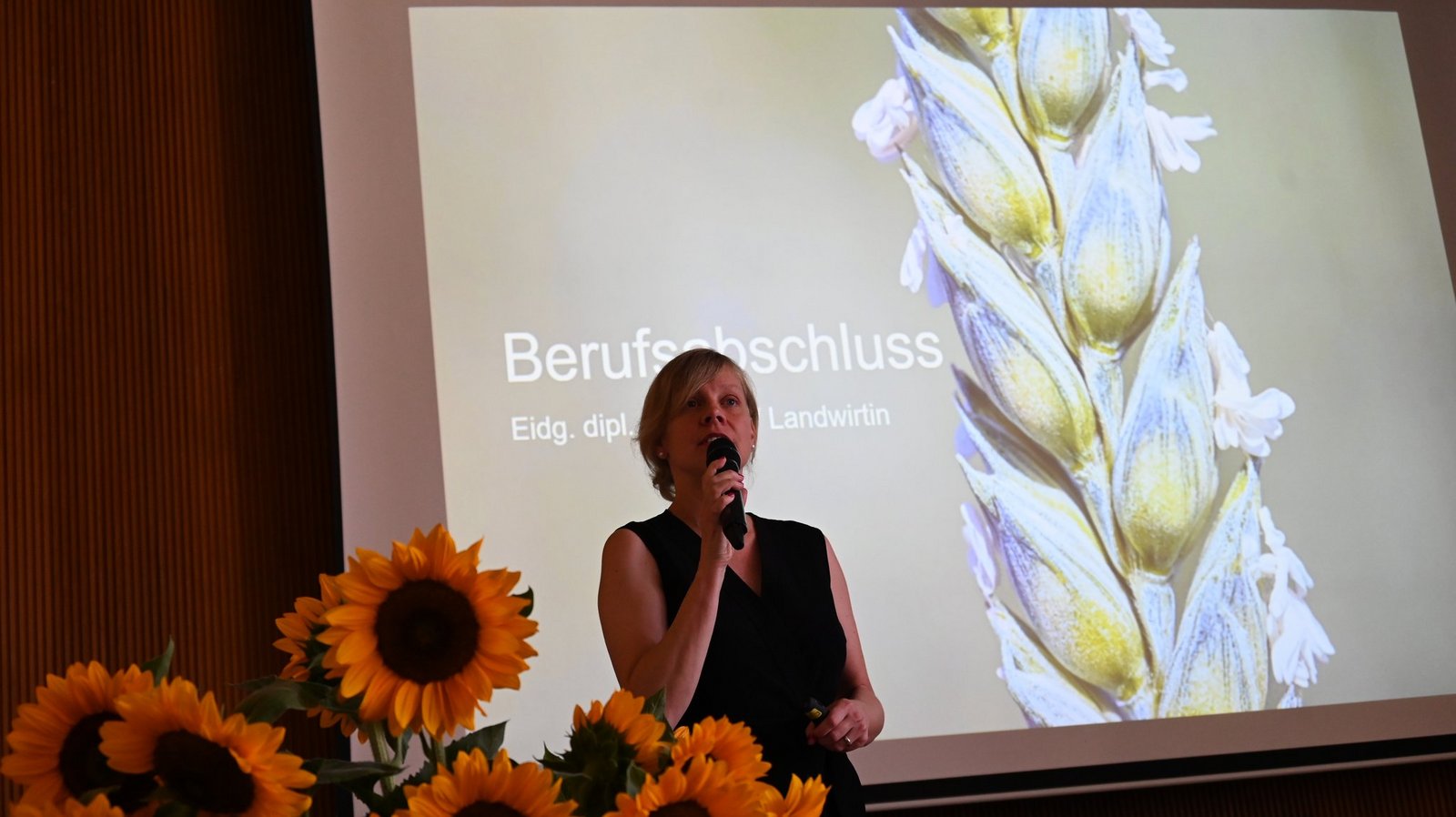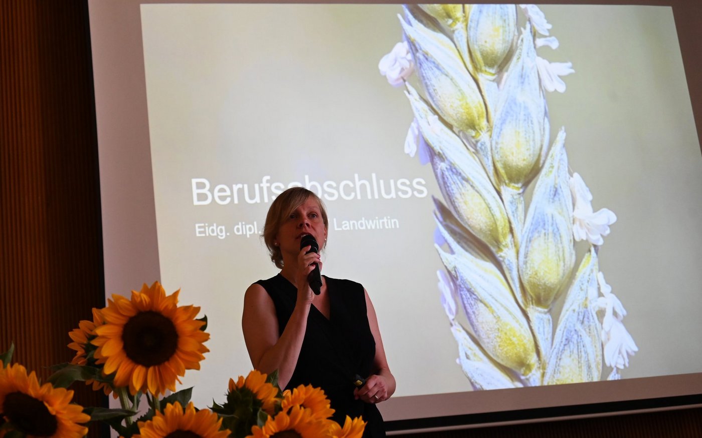 Einen speziellen Dank richtet Karin Aeberhardt, Leiterin Berufsfachschule Landwirtschaft 3. Lehrjahr Rütti, an die Lehrmeisterfamilien aus, welche den Auszubildenden ihr Wissen mit auf den Weg geben. Traditionell begleiten die Lehrmeister des dritten Lehrjahres ihren Schützling zur Abschlussfeier. Doch Karin Aeberhardt ist es wichtig, zu betonen, dass den Lehrmeistern im ersten und zweiten Lehrjahr ebenso ein Dank gebühre. «Tragt den Dank an diese Lehrmeister im ganzen Kanton hinaus», fordert sie auf. [IMG 14]