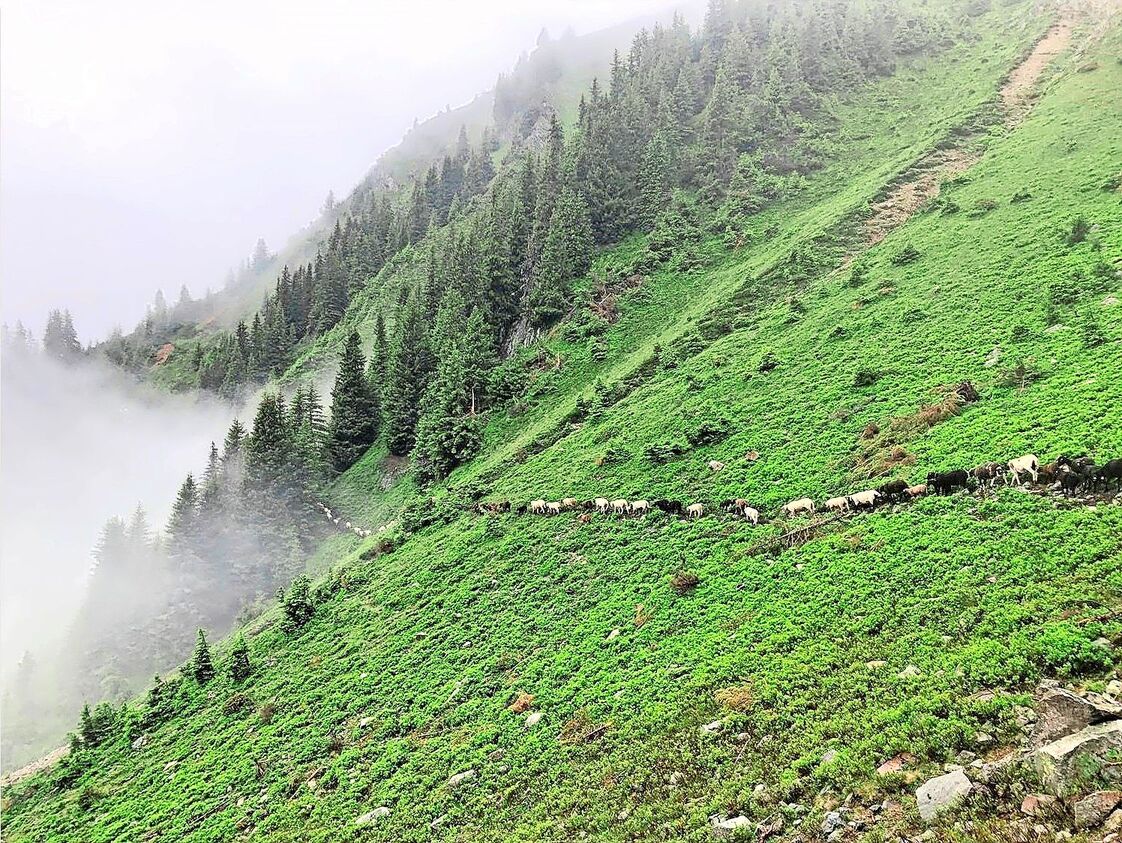 Mitte Juli: Immer wieder freue ich mich, zu sehen, wie die Herde im Morgennebel einer Perlenschnur gleich von der Nachtweide in Richtung Weidegebiet läuft. Meine Mithirtin und zwei Herdenschutzhunde laufen voraus, ich, drei Herdenschutzhunde und meine Hütehunde hinterher. In der Mitte: die Herde.