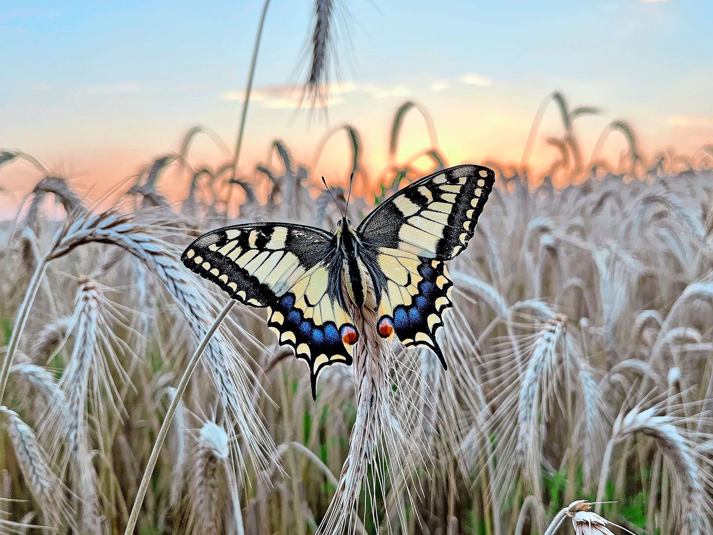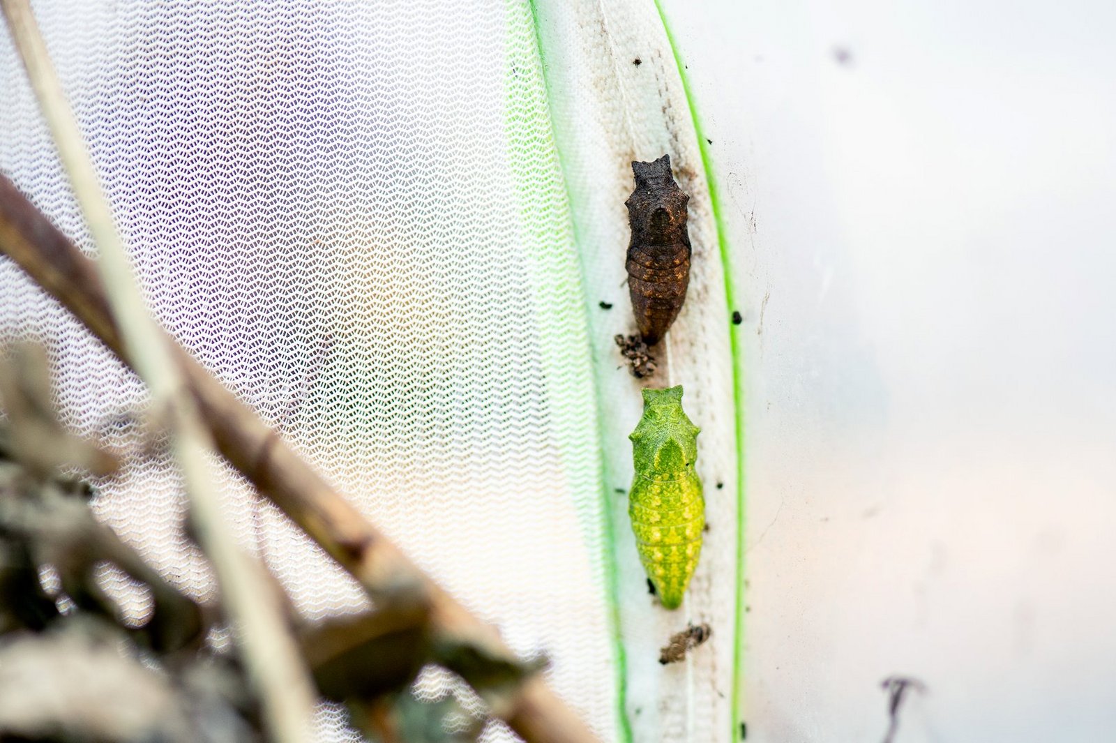 Schmetterling: Nach ungefähr 10 Sonnentagen (das Aerarium nicht direkter Sonneneinstrahlung aussetzen) wechselt die Puppe ihre Farbe von grün zu braun und es schimmert das Muster der Flügel durch. Dann geht es nur noch Stunden oder Minuten, bis die Puppe aufplatzt und der Schmetterling schlüpft. Zu Beginn hat dieser noch zerknitterte, weiche Flügel, bevor die ganze Schönheit nach ungefähr zwei Stunden zum Vorschein kommt. Sobald es so weit ist, den Schwalbenschwanz in die Freiheit entlassen, indem man das Aerarium einfach öffnet. Ansonsten besteht die Gefahr, dass er sich beim Flattern die Flügel stösst und verletzt.