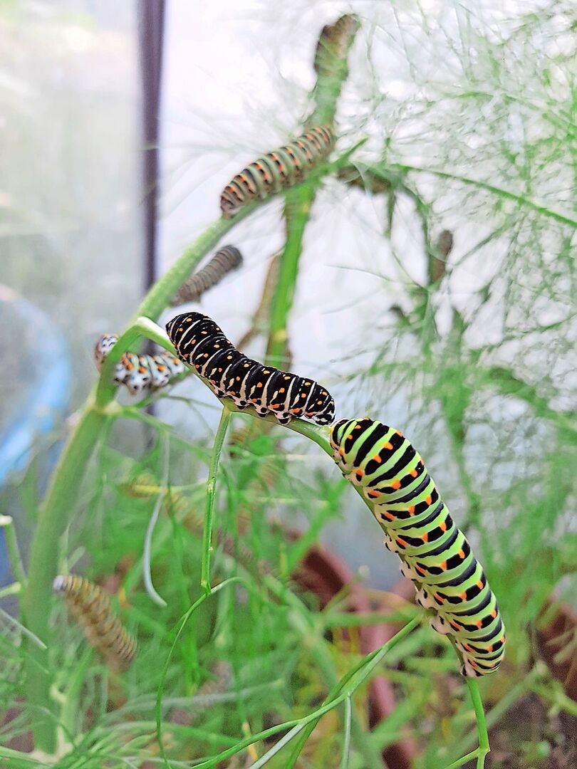 Raupen: Sind die Raupen geschlüpft, wechseln sie selbstständig auf das frische Kraut. Da bitte beachten, dass der Behälter, in dem die Futterpflanze steht, geschlossen ist, damit die Raupen nicht ertrinken, wenn sie herunterfallen. Das kann beispielsweise ein Marmeladenglas sein, in dessen Deckel Löcher für die Stiele gebohrt werden. Ist die Futterpflanze gefressen oder wird gelblich, sollte diese ersetzt werden. Sprich, es wird frisches Grün dazu gestellt, sodass sich die alte und die neue Futterpflanze berühren und anschliessend wandern die Raupen von selbst zum frischen Kraut. Die Raupen häuten sich vier- bis fünfmal und ändern ihre Farbe von Dunkel zu Dunkel mit hellem Punkt, optisch ähnlich eines Vogelkotes, bis sie dann die charakteristische grün-orange-schwarze Musterung hat.