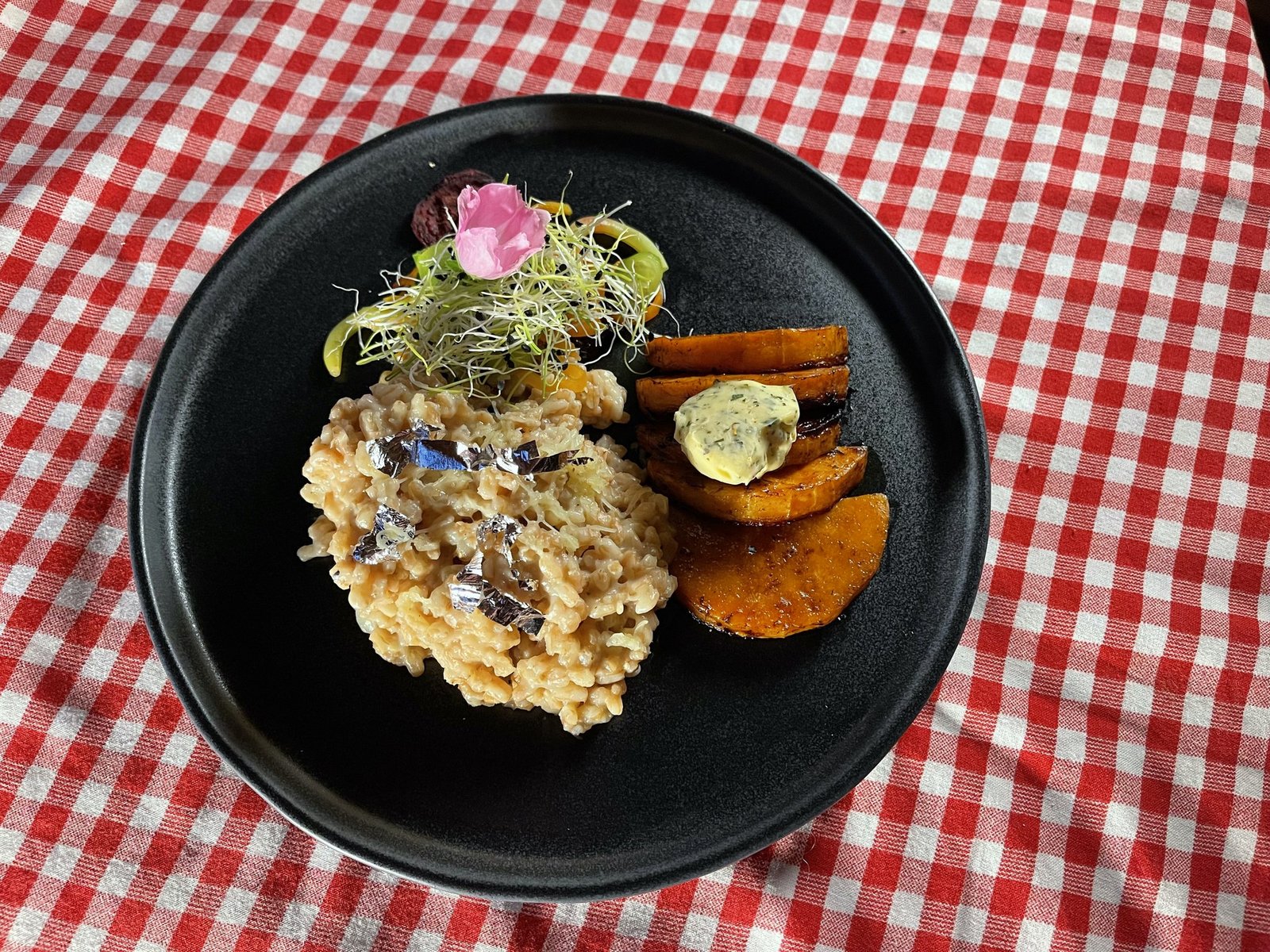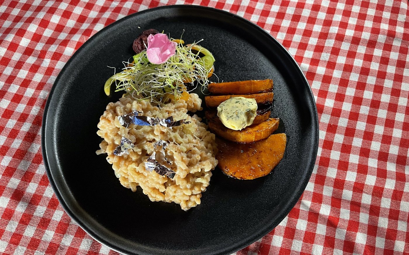 Risotto auf vorgewärmte Teller anrichten. Kürbisschnitze mit etwas Sauce dazu anrichten. Gemüse dazu legen und mit Zwiebelsprossen belegen.