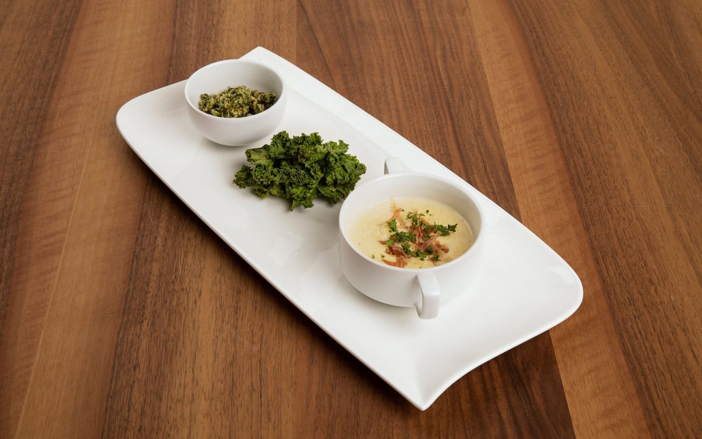 Maissuppe in vorgewärmten Suppentassen anrichten. Mit gebratenen Schinkenspeckstreifen und Schnittlauch dekorieren. Kräuterstreusel und Federkohlchips dazu anrichten.