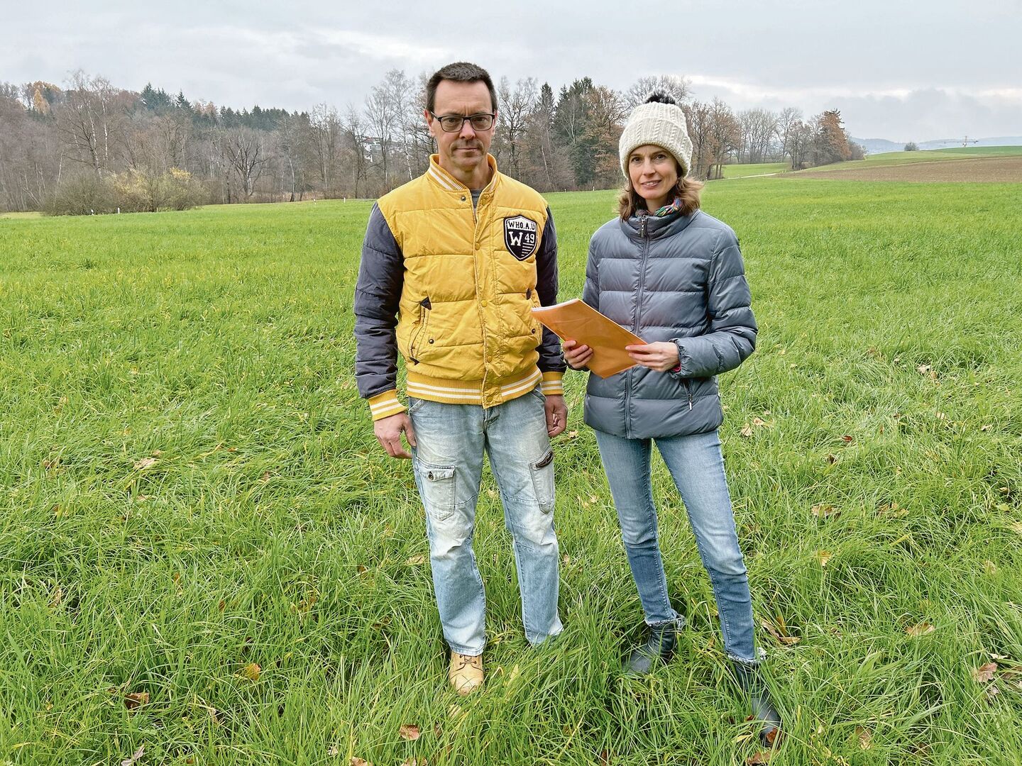 «Aufgrund der Topografie macht eine Vernässung in unseren Augen auch keinen Sinn», sagt Martin Hübscher und zeigt auf die Parzelle. «Auf dem mittleren Teil dieser Parzelle führten wir 2016 auf 6100 m² eine Bodenaufwertung durch», sagt Martin Hübscher. Es ergab sich dann eine weitere Gelegenheit, aus der Region Humus zu erhalten, so beschlossen sie 2020, auch die restliche Fläche der Parzelle aufzuwerten.