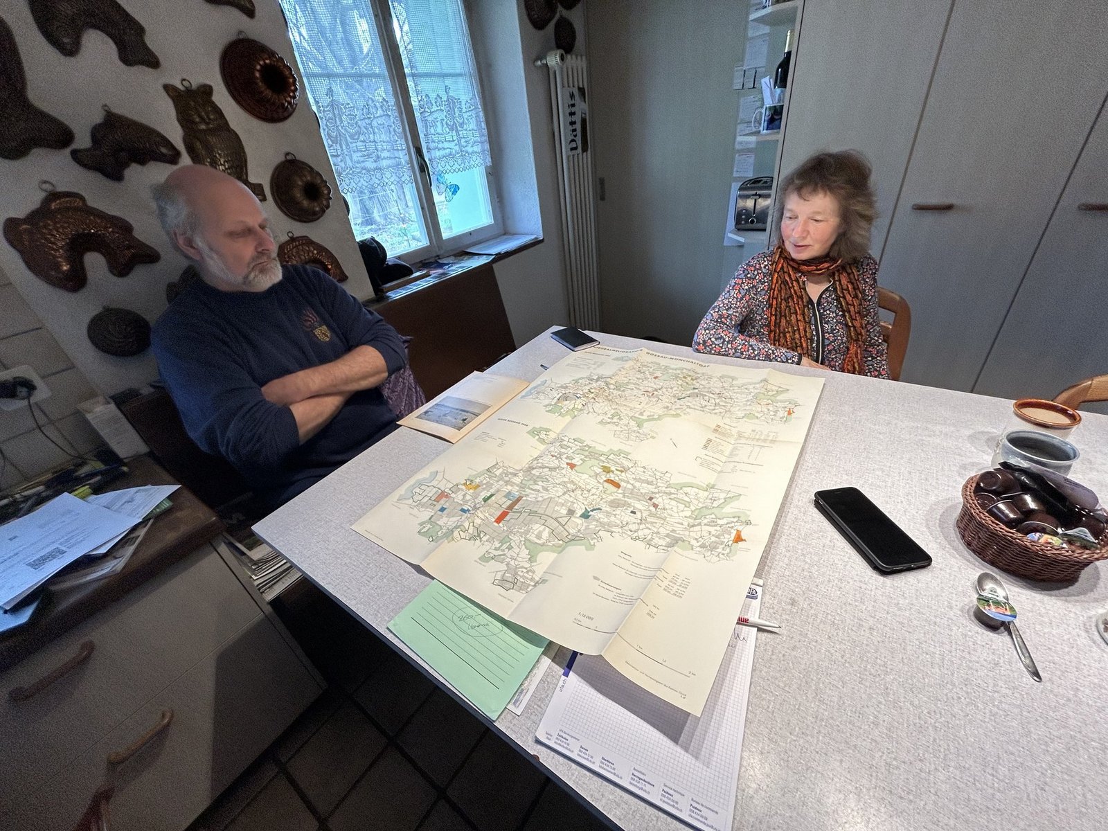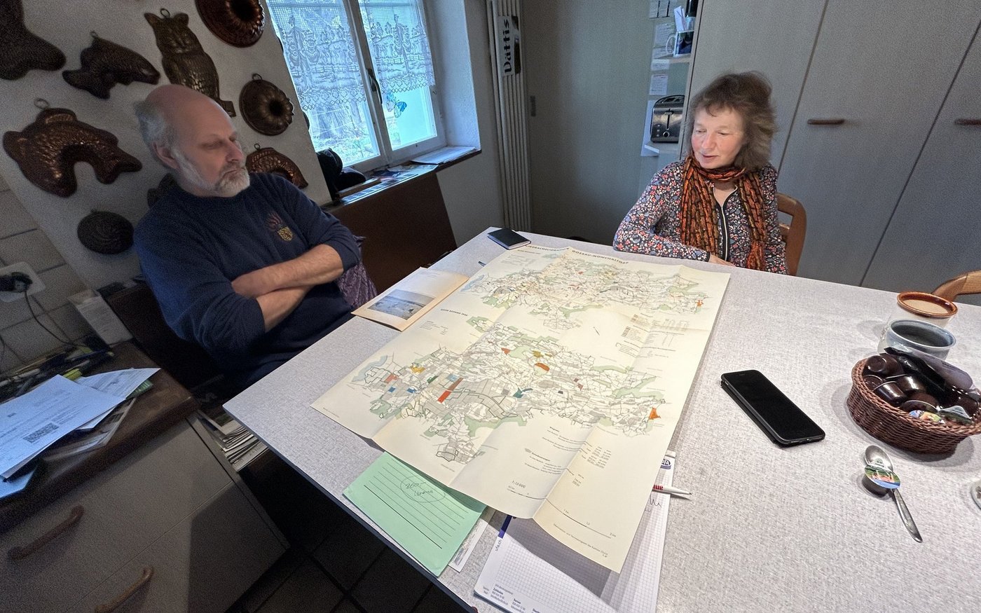 Maya und Markus Hächler sitzen am Küchentisch und breiten eine grosse Karte aus. Darauf ist die Melioration Gossau-Mönchaltdorf aus den 1940er Jahren aufgezeichnet. Auch die Flächen ihres aus dem Bernbiet kommenden Urgrossvaters wurden zusammengefügt. [IMG 2]