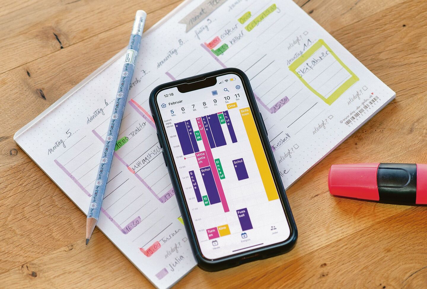 Wir benutzen die App «FamilyWall», die sowohl ich als auch mein Mann auf dem Handy haben. So sehen wir beide sämtliche Termine. Mein Mann hat auch vom Geschäft einen solchen Plan, diesen teilt er mir jeweils mit.