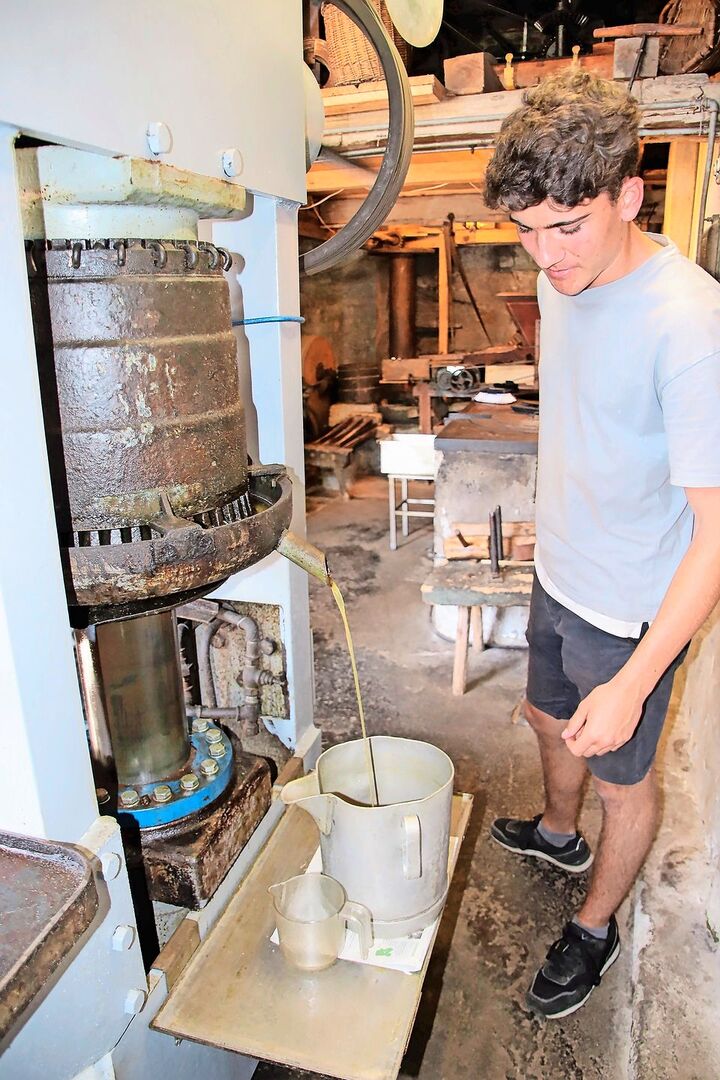 Nun konnte der eigentliche Pressvorgang beginnen. Dabei wurde der Presszylinder auf der rund 80-jährigen Presse mit Wasserdruck angehoben und der Manometer stieg bis auf 480 Bar an. «Dies entspricht einem Pressdruck von rund 90 Tonnen», erklärte Spalinger der staunenden Besucherschar. Währenddessen lief das wertvolle Speiseöl aus dem kleinen Presskorb in einen Eimer. Aus einem Pressvorgang mit etwa 12 Kilogramm Nusskernen gibt es rund 5 Liter Öl.