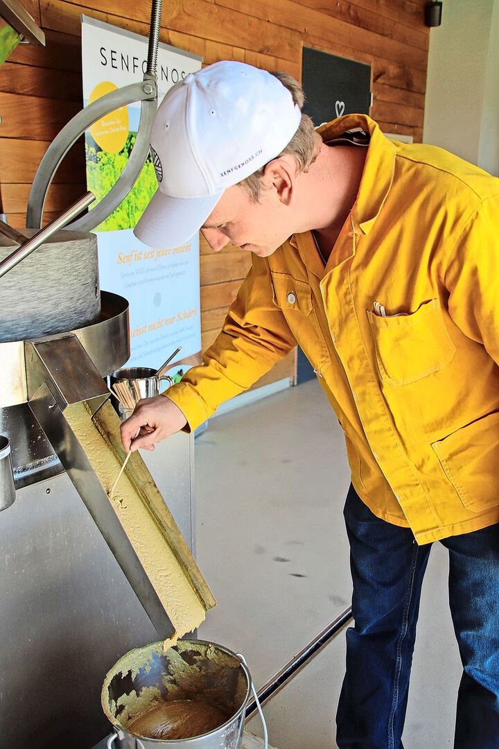 Vor einigen Jahren gründeten Ueli Kilchsperger und Beat Vögeli in Flach das Kleinunternehmen Senfgenoss. Im Gegensatz zur Marthaler Öle steht hier für die Herstellung von Senf neuste Technik zur Verfügung. «Unse-re Senfmühle mit den beiden 300 Kilogramm schweren Mahlsteinen aus Granit haben wir extra dafür konstruieren und bauen lassen», erklärt Kilchsperger auf seinem Weingut, wo die Anlage steht. Die beiden Kleinunternehmer produzieren im traditionellen Kaltmahlverfahren Senf – ohne Geschmacksverstärker, Farbstoffe und Zuckerzusatz. «Für unsere Spezialitäten verwenden wir sowohl schwarzen wie auch gelben Senf», so Kilchsperger. Wobei der schwarze Senf in der Schärfe deutlich intensiver sei.