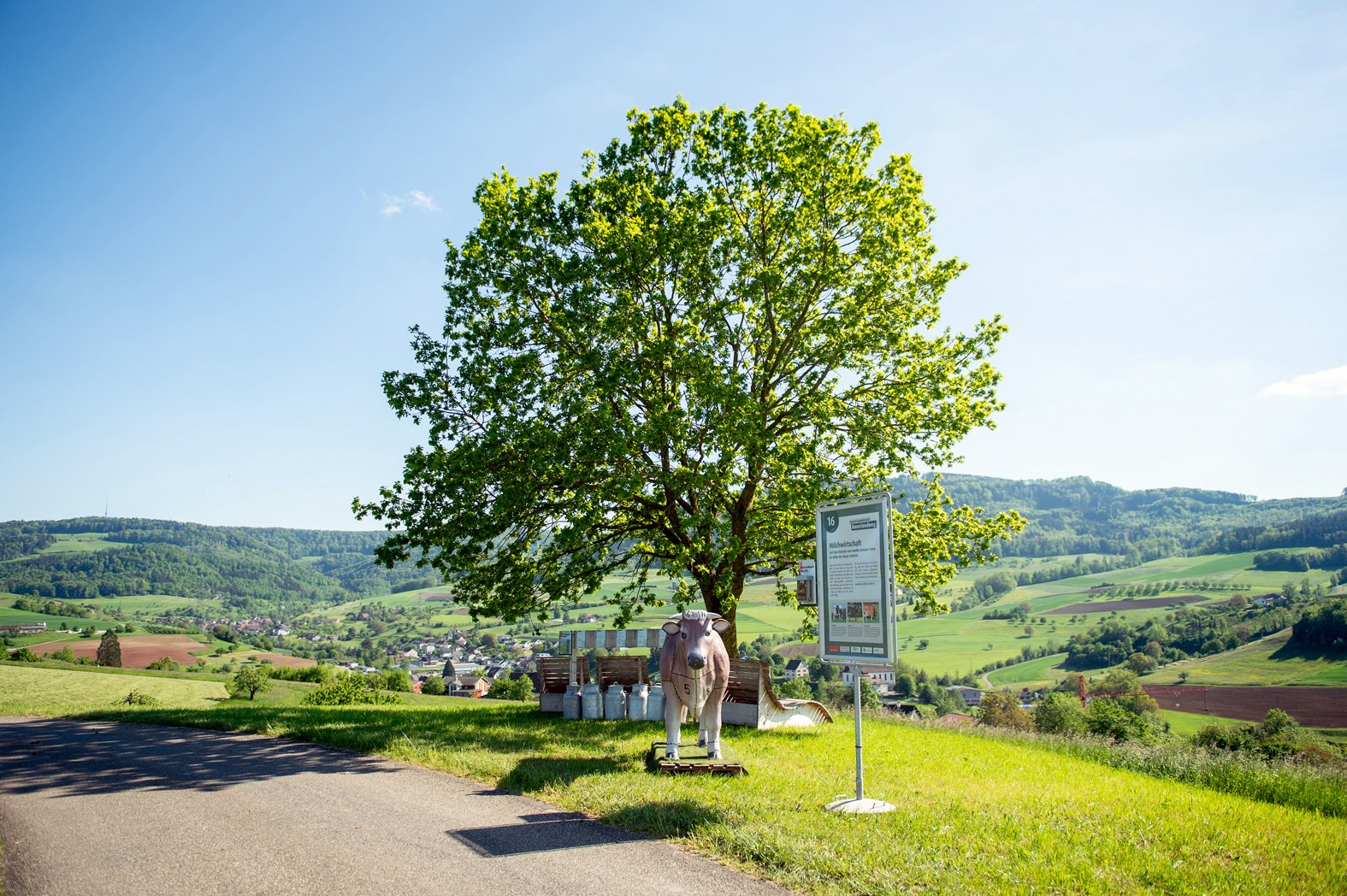 Oben angekommen, geniesst man – wie versprochen – einen tollen Ausblick über Wölflinswil, die umliegende Gegend, Kleinstrukturen und Hochstamm-Obstbäume. Zusätzlich kann bei einem weiteren Posten durch ein Viscope-Teleskop die Umgebung erkundet werden. Die Posten sind vielseitig und gehen von Memory-Spielen zu Bienen-, Pferde- und Schweinebeobachten bis hin zu Infos über die Landwirtschaft und die Gegend.