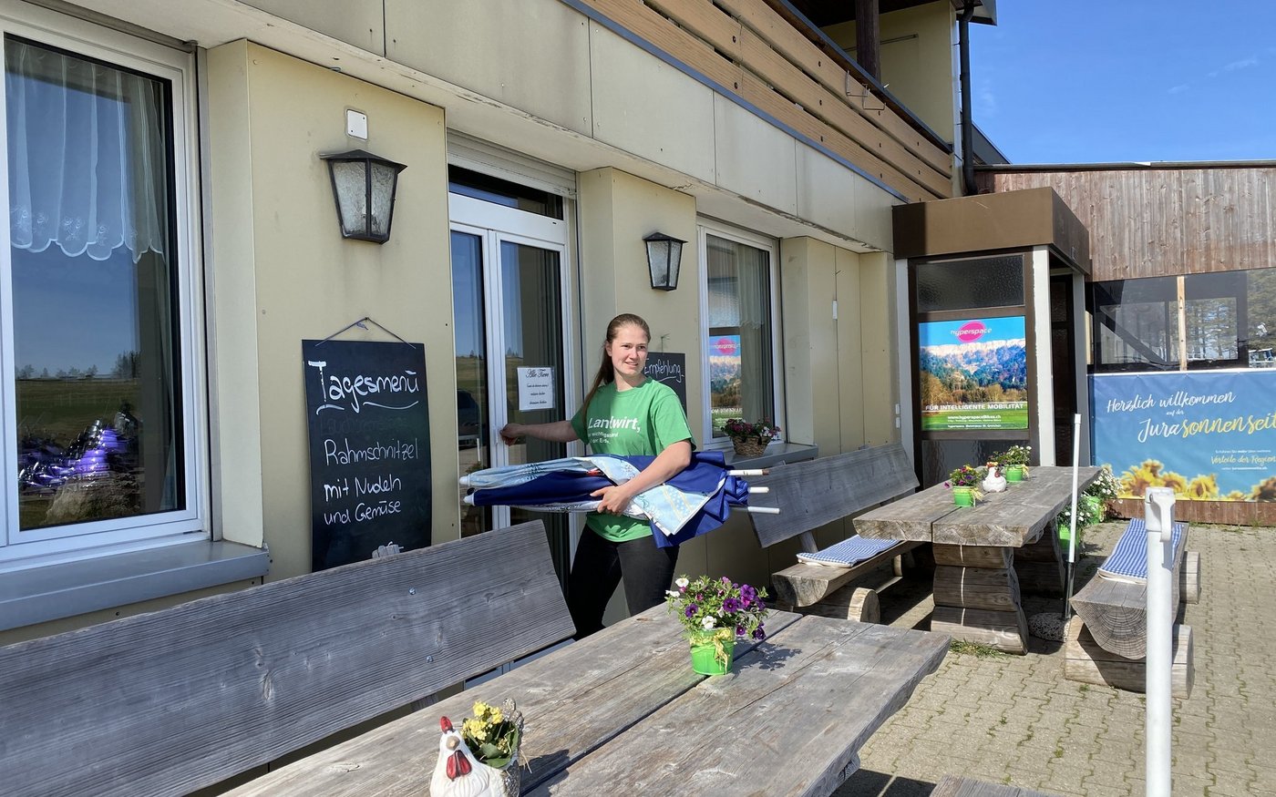 Bis auf Weiteres kurvt Fabienne Kaufmann mit dem Traktor oder per Quad über die Wiese. Beim Restaurant angekommen, springt Mingo vom Fahrzeug, seine Besitzerin folgt ihm ohne Eile. Der Wind zerzaust die farbigen Blumen auf den Terrassentischen und die angehende Landwirtin klappt die Sonnenschirme zusammen. Für heute ist Feierabend – zumindest in der Beiz. Nebenan muht das Vieh und die kleine Gruppe Schafe marschiert selbstständig in Richtung Stall. Noch gibt es Einiges zu tun, das Fabienne Kaufmann mit ruhiger Selbstverständlichkeit in Angriff nimmt.