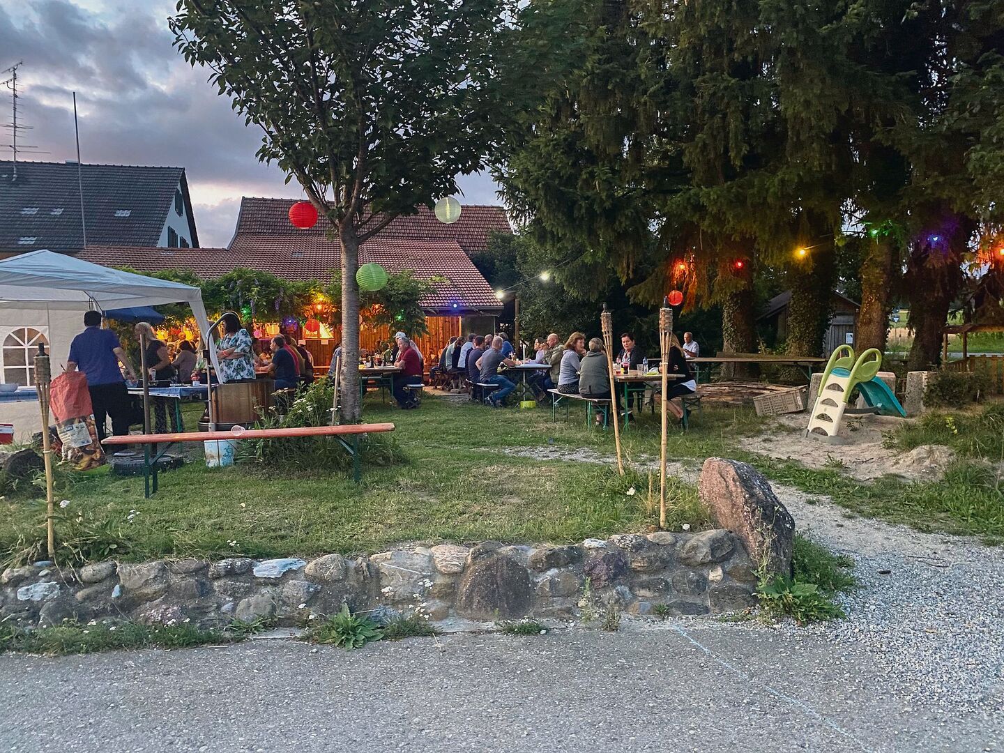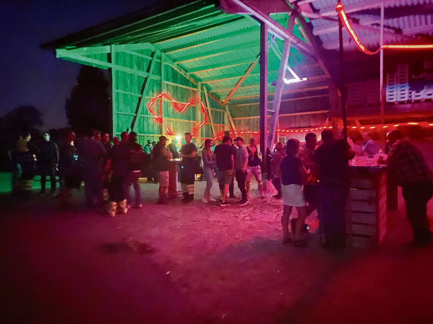 Auf den ersten Blick sieht der Anlass auf dem Bauernhof von Claudia und Stefan Ulrich im Zürcher Unterland eher nach einem gemütlichen Grillabend aus. Nachdem der Eingang passiert ist, steht man vor einem schön geschmückten Rasen. Bunte Lichterketten zieren die Bäume auf der Wiese. Popmusik untermalt den lautstarken Small Talk. Für ein buntes Bild sorgen auch die Eintrittsbändel: geknickte Leuchtstäbchen, deren Farbe Auskunft über den jeweiligen Beziehungsstatus geben. Grüne Bändel für Singles mit Hof, orangene für Singles ohne Hof und rote für Personen, die bereits in einer Beziehung sind.
