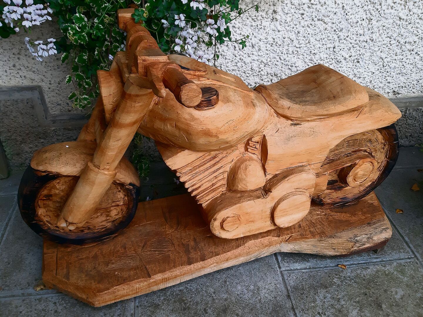 Bevor sich Reto Gertsch an die Ausführung eines Auftrages macht, besucht er die Kundinnen und Kunden. «Beim persönlichen Kontakt erfasse ich die Situation und spüre, was passen könnte. Das ist sehr wichtig für mich. Denn, ob das Objekt später bei einem Ferienhaus im Jura steht oder doch bei einem Reihenhaus in der Stadt Biel, macht einen grossen Unterschied», weiss Gertsch. Für ihn sind die besten Aufträge diejenigen, bei denen er zunächst denkt: «Das ist unmöglich, da werde ich scheitern.» Er zweifelt manchmal an seinen Fähigkeiten und sagt: «Ich weiss, dass ich mit den Vollprofis nicht mithalten kann.» Der Handwerker sagt von sich selbst, dass er meist ohne Konzept und eher chaotisch ans Werk gehe. «Komischerweise kommt es immer so, wie ich es mir vorher vorgestellt habe.» Bei technischen Objekten, wie etwa der Harley, zeichne er sich lediglich Hilfslinien an. Dieser Auftrag zu einem runden Geburtstag sei eine Challenge gewesen, gesteht er und lacht dabei verschämt. Mit dem Ergebnis ist er aber zufrieden und auch der neue Besitzer ist es vollends, weiss die Schreibende. War denn diese Harley der bislang schwierigste Auftrag? Nein, erklärt Reto Gertsch. Das Schwierigste sei eine Dampflokomotive im Massstab 1:20 gewesen. «Die war am Schluss super!», erinnert er sich und strahlt dabei übers ganze Gesicht. Auf die Frage, ob ihn die Ergebnisse stolz machen würden, sagt Gertsch: «Ich empfinde Genugtuung, Stolz eher nicht. Was die Nordamerikaner mit ihren Sägen ins Holz zaubern, ist Kunst. So was herzustellen, würde mich stolz machen.»
