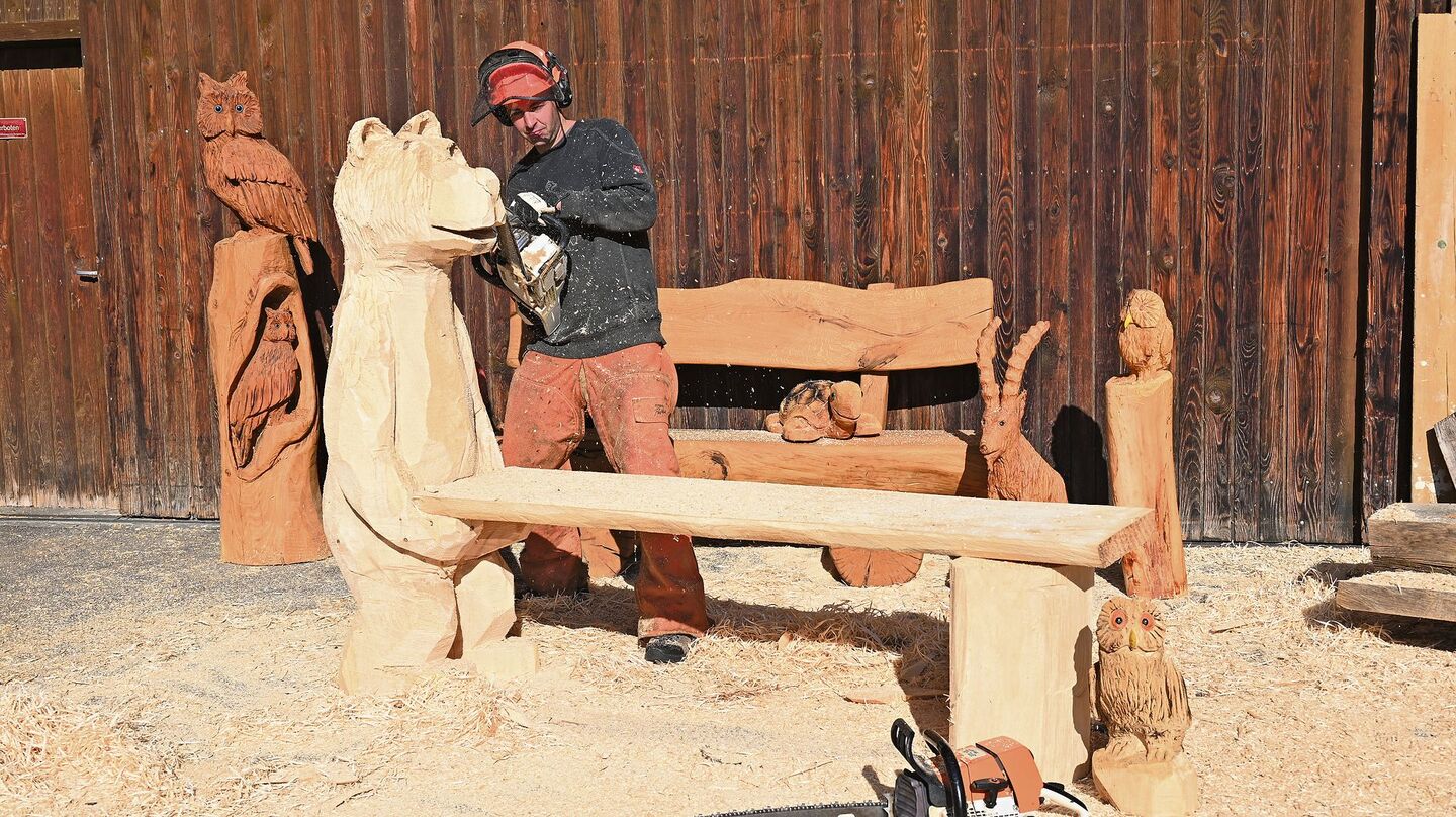 «Holz bedeutet für mich wachsen und leben. Es ist unglaublich respekteinflössend vor einem Baumstamm zu stehen, der 180 Jahre gewachsen ist.» Der, der das sagt, ist Reto Gertsch, gelernter Forstwart, Baumpfleger und Landschaftsgärtner. Viele Jahre lang arbeitete er beruflich mit Holz und dieses begleitet ihn heute noch in der Freizeit: Er stellt mit der Kettensäge Dekoelemente aus Holz oder Baumstümpfen her. Die Folgen eines Arbeitsunfalls vor rund acht Jahren zwangen ihn jedoch, beruflich umzusatteln, weg vom Holz. Geblieben ist das Hobby. Gertsch, der nicht als Künstler betitelt werden will, sitzt in Schwadernau, wo er seine Werkstatt hat, auf seinem aktuellen Projekt, einer Sitzbank. Die Herbstsonne wärmt, vor der Werkstatt liegen Holzstämme und es riecht nach Sägespänen. Er sei auch kein Kunsthandwerker, sondern einfach nur Handwerker, macht Gertsch in dieser Kulisse unmissverständlich klar.
