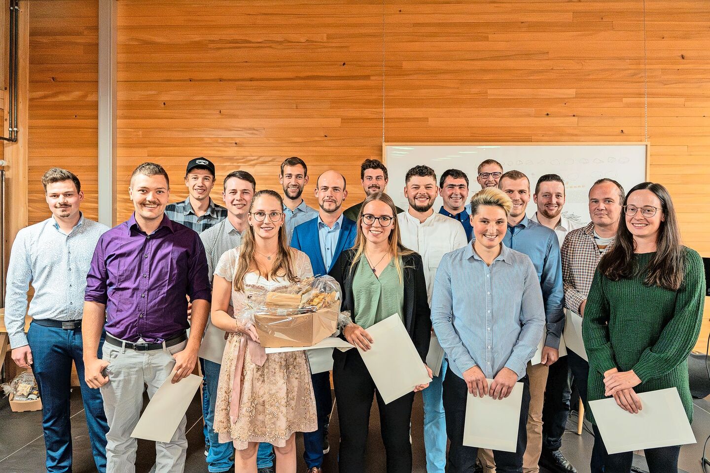Vier Frauen und 13 Männer konnten nach dreijähriger berufsbegleitender Ausbildung am Rheinhof Salez ihr Diplom «Agrotechniker(innen) HF» entgegennehmen. Dabei überreichte Laveba-Verwaltungsratspräsident Josef Schmid den Preis für die beste Abschlussnote an Anita Ruffner.