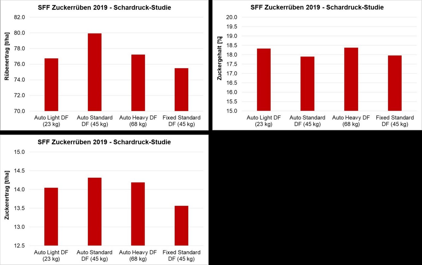 Beim Vergleich der unterschiedlichen Schardruckeinstellungen zeichnete sich die Schardruckvariante mit automatisch regulierendem Schardruck auf den Zielwert von 45 kg mit dem höchsten Ertrag aus. Die Sämaschine misst und regelt den Schardruck via Sensor in Echtzeit, damit permanent 45 kg Schardruck ausgeübt werden. Der niedrigste Rübenertrag im Schardruckvergleich wurde mit der fixen Schardruckvariante auf dem Zielwert von 45 kg erreicht.